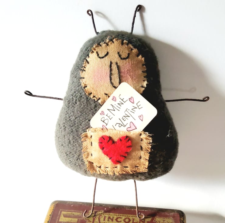 This bug is made from sweatshirt fabric with a vintage coffee dyed linen embroidered face and pocket. The antennae, arms and legs are rusty wire. The little tag has been hand written in Indian ink with watercolour tints.