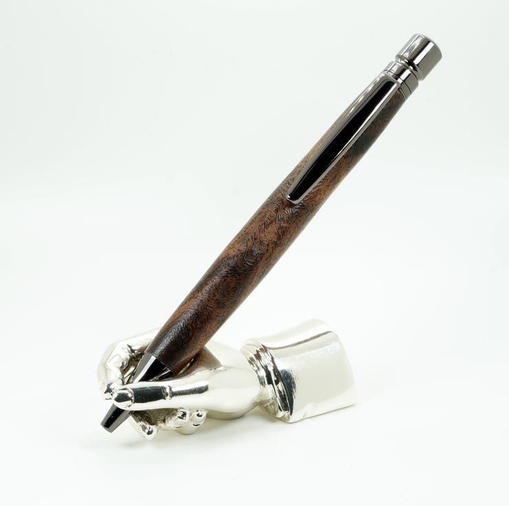 This pen was hand turned by me in my workshop in Bures, Suffolk, the metal parts are a gunmetal dark chrome finish, Included in the price is a black card presentation box
