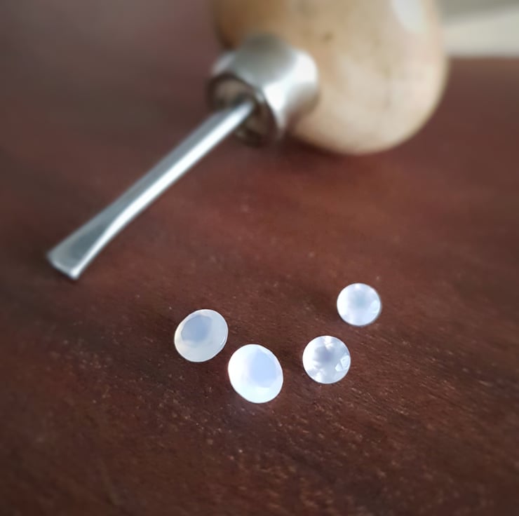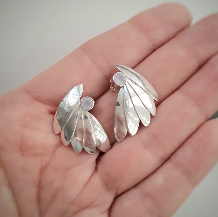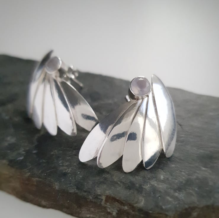 This pair of earrings resemble spread out wings, or petals, with translucent milky white faceted chalcedony set at the centre of each. The stones have a slight hint of icy blue and peach tones in them too making them particularly attractive. The earrings have been polished to a mirror finish. They secure with butterfly backs, like stud earrings.