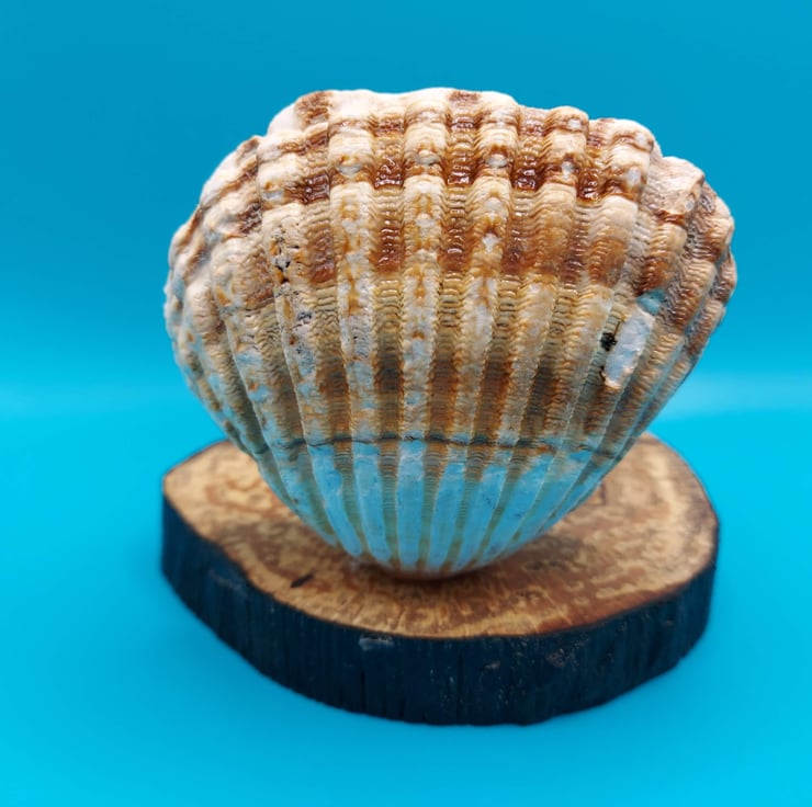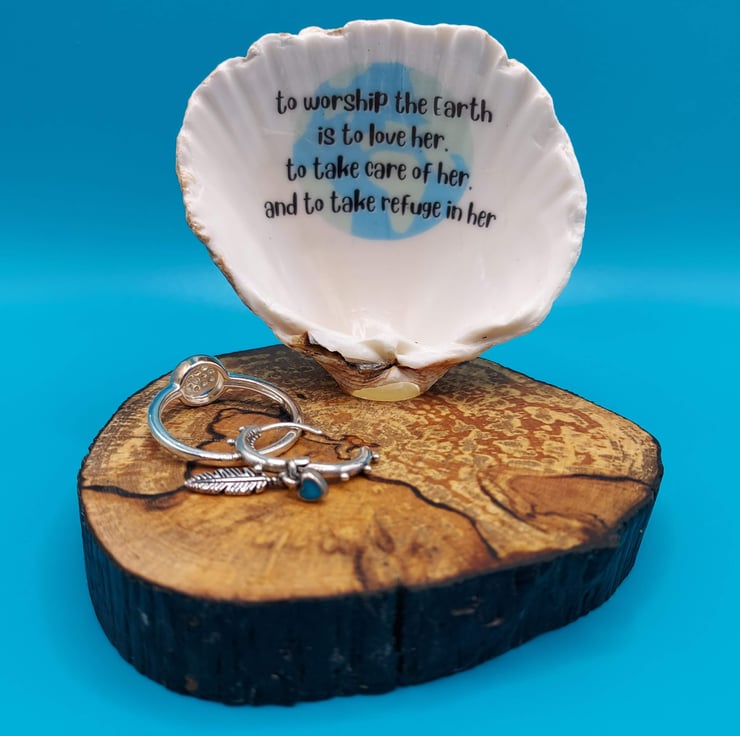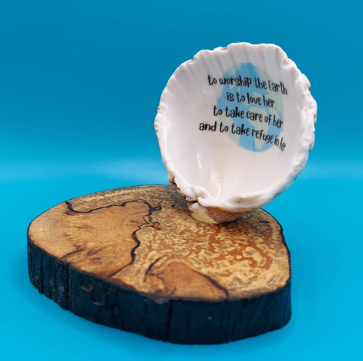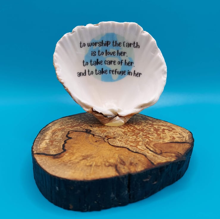 Shell from the Jurassic Coast mounted on spalted driftwood, with 'To worship the Earth is to love her, to take care of her, and to take refuge in her' quote, attributed to thich nhat hanh known as the "father of mindfulness", Nhat Hanh was a major influence on Western practices of Buddhism