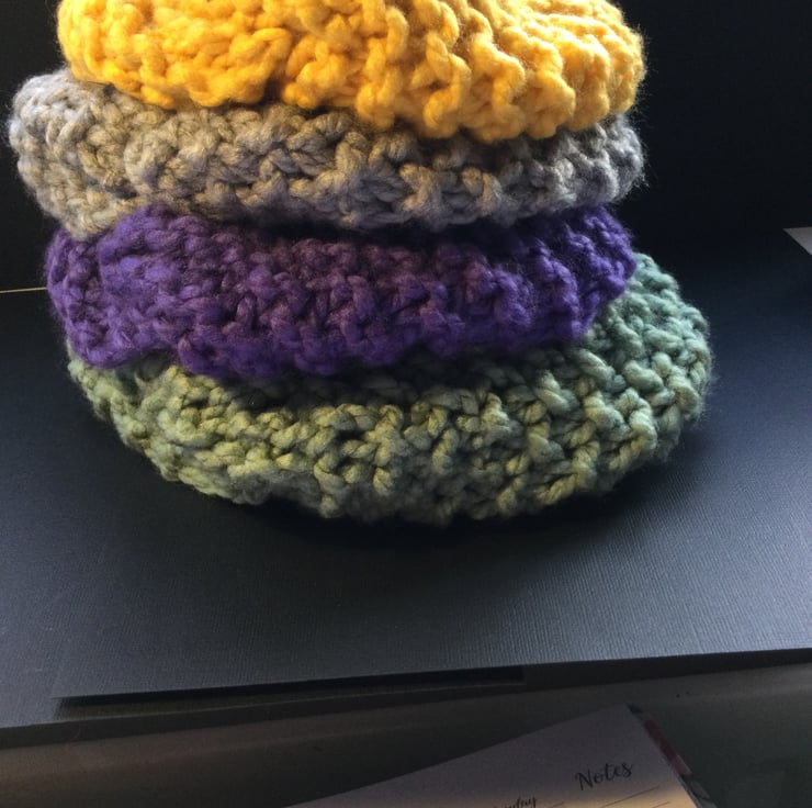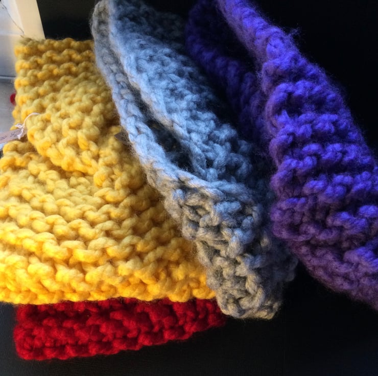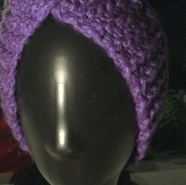 Hand knitted head and ear or neck warmer. Knitted in purple. acrylic , super chunky yarn. The cosy pull on “hat” measures approximately 18 inches (46 cm) round. But has much more stretch to reach around you eat and cover your ears in soft cosinness. It has a twist in it and I’ve discovered that if you pull it down over your head it sits nicely around your neck keeping your neck cosy as well.