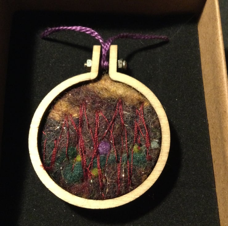 This necklace is one of my 1st embroideries. I wanted to make something to appeal to my work colleagues when i was doing a craft Fair at work and so mini hoop necklaces were born.