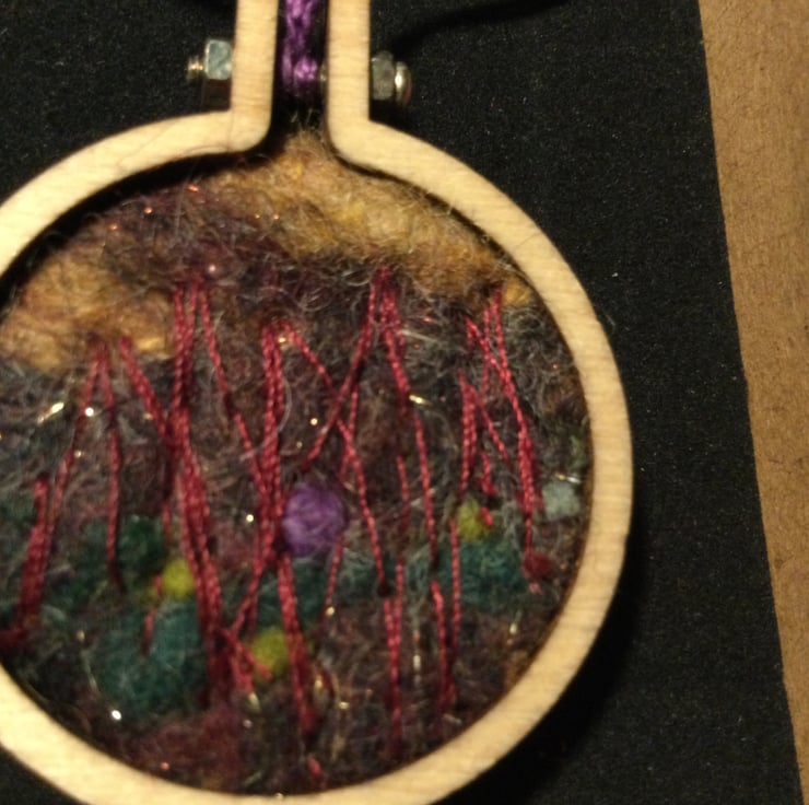 This necklace is one of my 1st embroideries. I wanted to make something to appeal to my work colleagues when i was doing a craft Fair at work and so mini hoop necklaces were born.