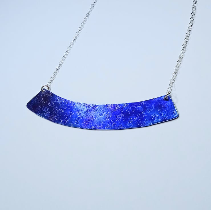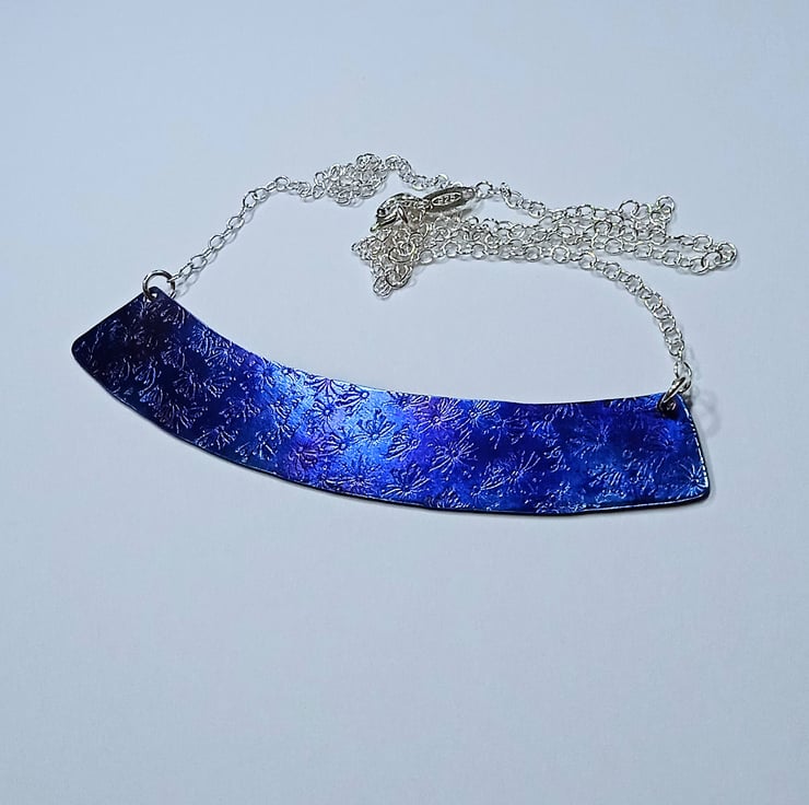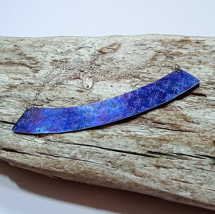 I have made this necklace by hand sawing the shape from titanium sheet and have applied an attractive hand stamped surface design before heat colouring. I have then attached sterling silver chain to create the necklace.