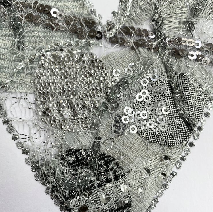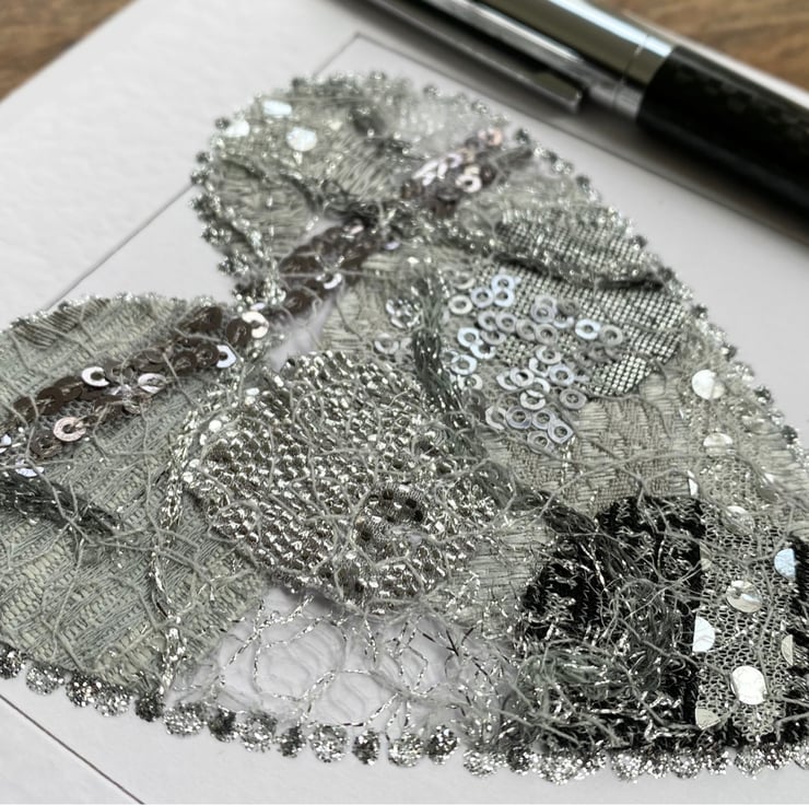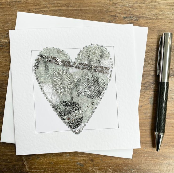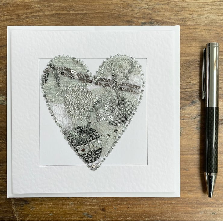 This beautiful embroidered heart has been made with my own handmade up-cycled fabric. Its been made from threads, fibres, cottons and enhanced with free motion embroidery. It’s framed with 3-D dots. It’s perfect for a wedding, anniversary, engagement, Valentines or for someone very special. It is blank inside making it ideal for any occasion. This white card measures 14.5 x 14.5cm, comes with an envelop and in a plastic cover for protection.