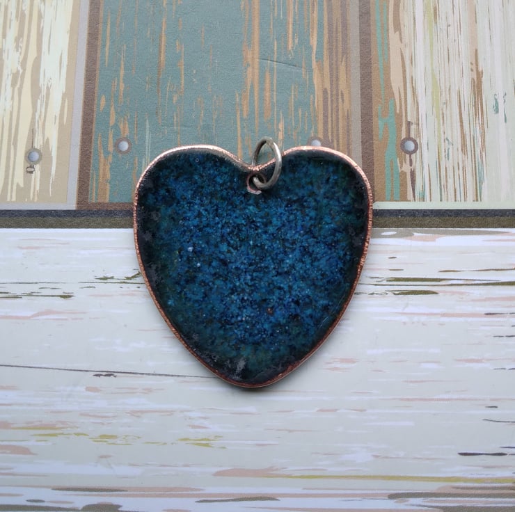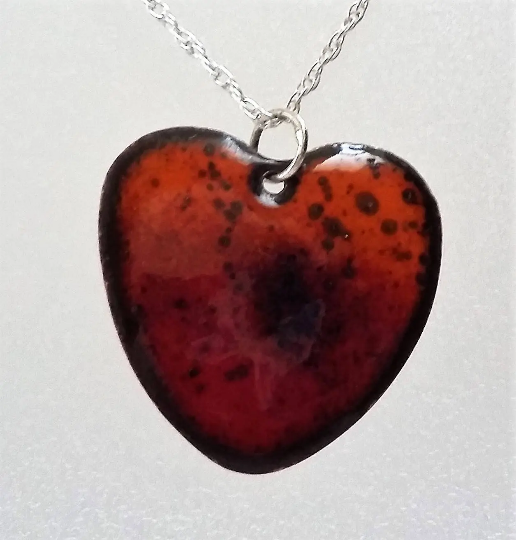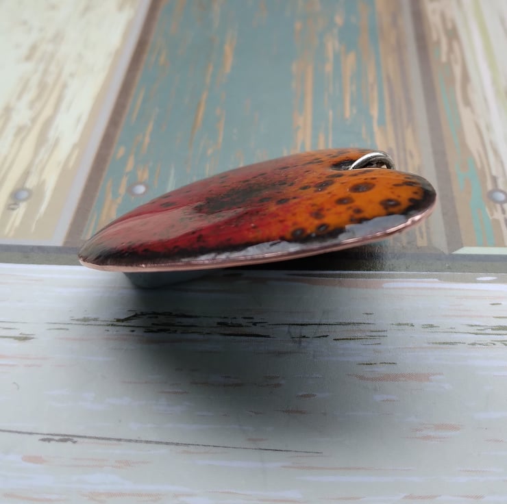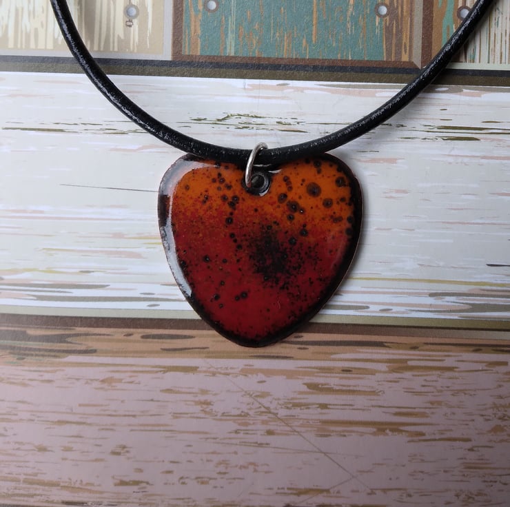 Heart shaped enamelled copper pendant in fiery shades of orange and red with black highlights. The pendant has been kiln-fired and measures approximately 25mm from tip to dip at the top of the heart, and 28mm across the widest part. The back has been finished in glossy tweedy-blue enamel, with the exposed copper edge being varnished to prevent marking of skin or clothing. It comes complete with a soldered sterling silver jump ring (6mm) and is supplied with a little organza pouch. An 18” sterling silver rope chain, or a 2mm leather cord (selection of lengths) finished with a magnetic clasp, can be purchased separately from my shop if needed – please see separate listings. If you are using your own chain, please ensure that it will fit through the 6mm jump ring, allowing for the thickness of the pendant.