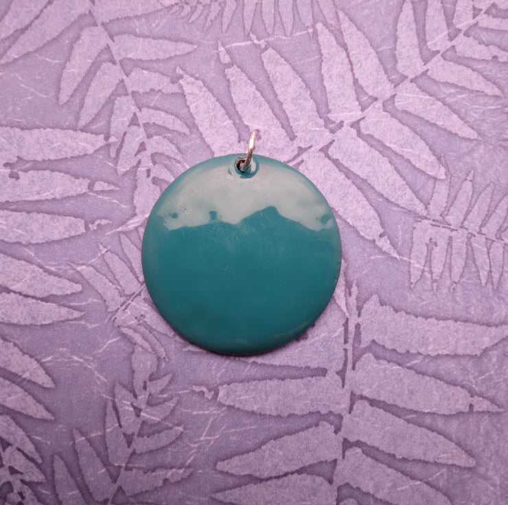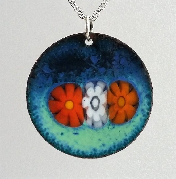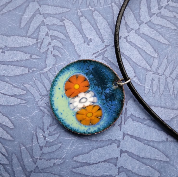 Round enamelled copper pendant in dark blue and light green, with three millefiori inserts. The pendant has been kiln-fired and measures approximately 30mm in diameter. The back has been finished in glossy turquoise enamel. It comes complete with a soldered sterling silver jump ring (6mm) and is supplied with a little organza pouch. An 18” sterling silver rope chain, or a 2mm leather cord (selection of lengths) finished with a magnetic clasp, can be purchased separately from my shop if needed – please see separate listings. If you are using your own chain, please ensure that it will fit through the 6mm jump ring, allowing for the thickness of the pendant.