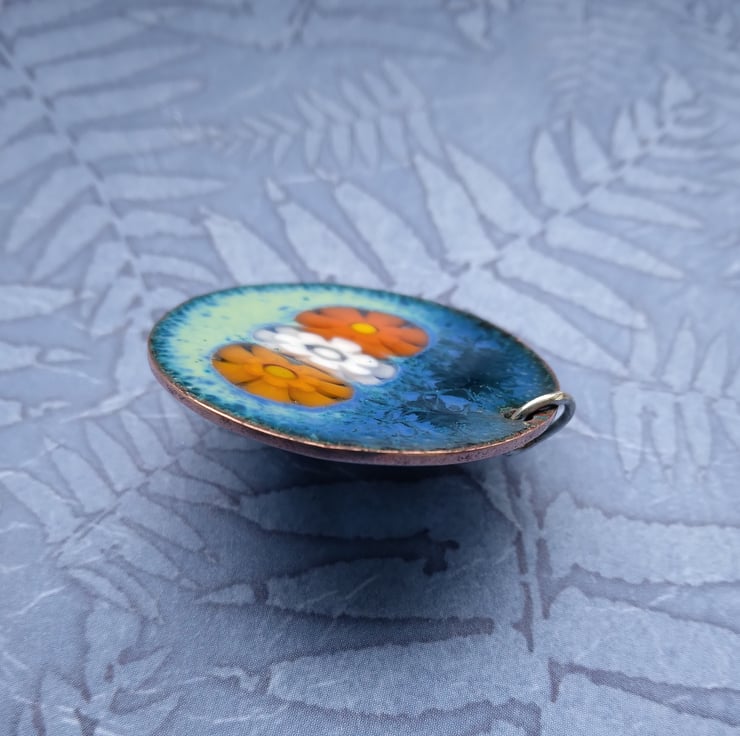 This enchanting pendant reminds me of a little rock pool, with the millefiori inserts very much resembling anemones. The colour of the ‘pool’ blends from light green at the bottom to a lovely rich, dark lapis blue at the top, with dark edging around the green. The inserts are in contrasting orange with a white one in the centre – a very tropical looking pool with its bold colours! For a change, I have put all the detail on the ‘inside’ of the domed copper blank, which greatly adds to the rock pool effect. A glassmaking technique which combines and fuses bundles of different coloured glass rods into patterns, cuts them into chunks and embeds them into glass items, Millefiori (literally ‘a thousand’ and ‘flowers’) is widely used for paperweights. Yes, and the same principle is used for seaside rock!