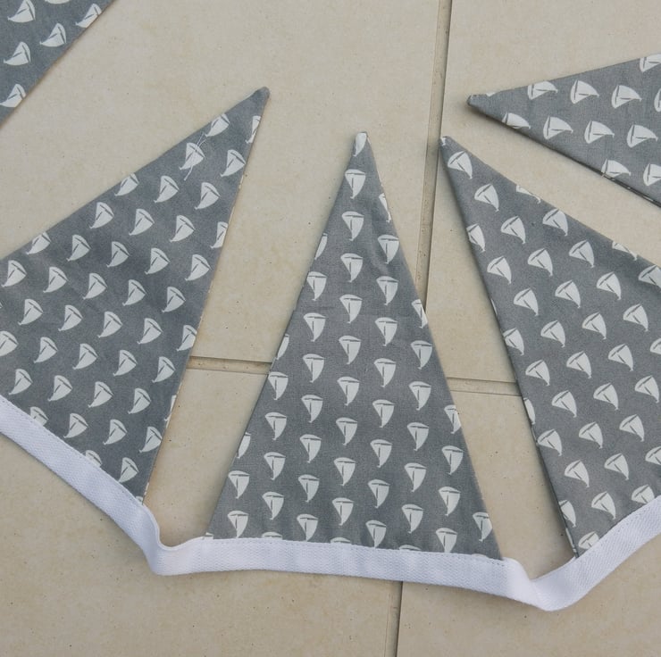 This fun bunting would be suitable for lovers of sailing, or as a different nursery decoration. It is made from cotton fabric featuring little white sailing boats. The white tape measures 2.5 metres total, with the measurement from first to last flag being approx. 1.45m (57 inches). This gives a generous length of bunting, with ties at each end for hanging. Each of the ten flags is 16cm (6.5 inches) deep.