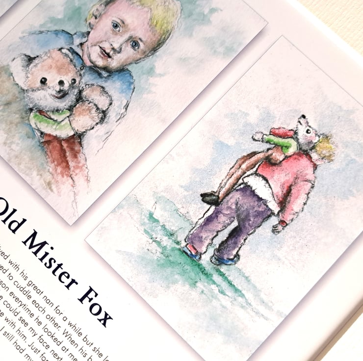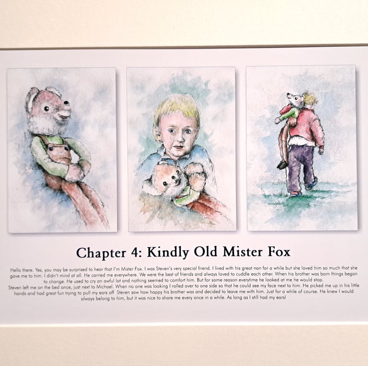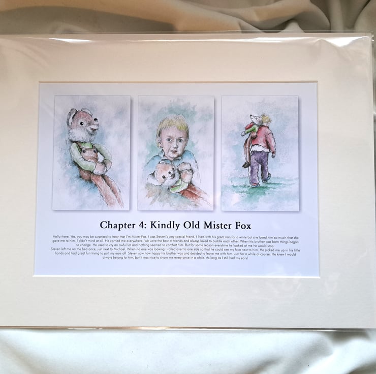 Original hand painted watercolour print of a child holding a fox, story for charity. Presented unframed, fully mounted ready for your own frame. (A4 print, mount: 16" x 12"). 'Every picture tells a story.' Taken from the illustrated book 'I am Michael Glare and this is my Life', with over 400 watercolour illustrations like this.