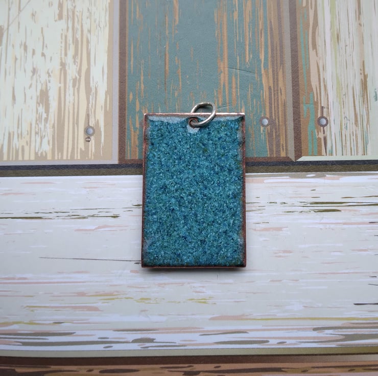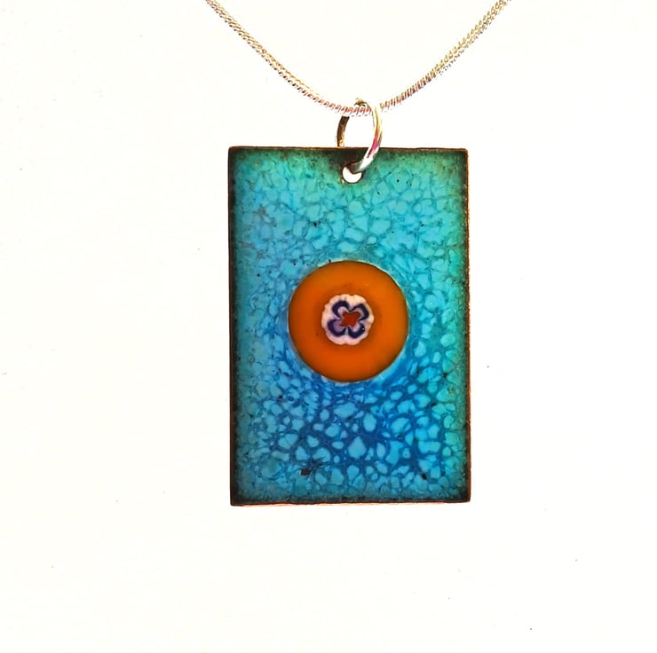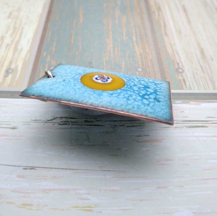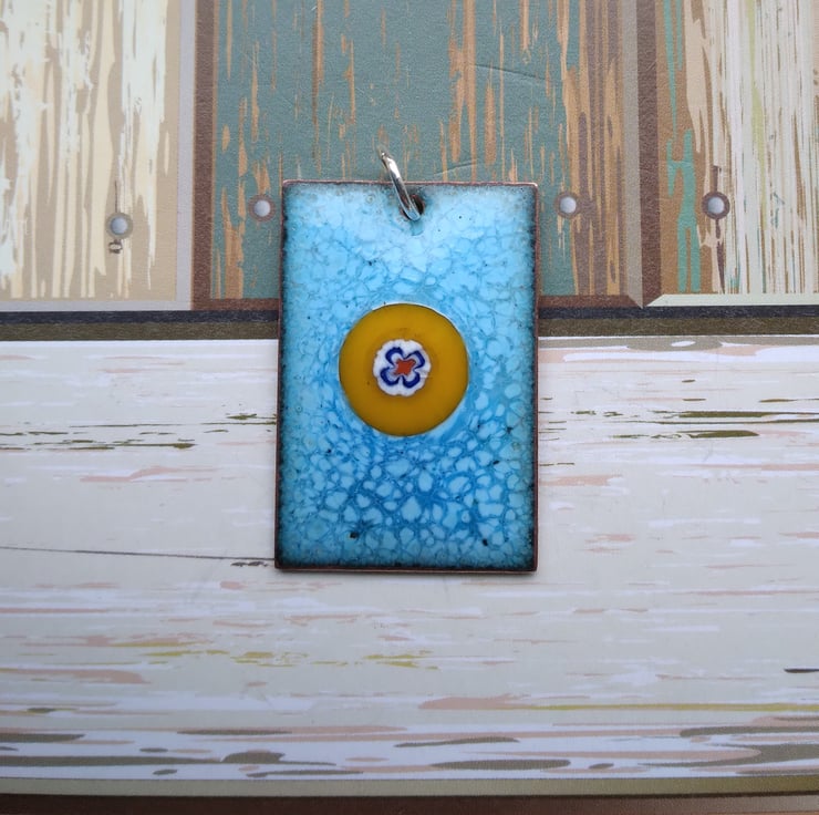 Rectangular copper pendant in mottled blue enamel, with a central yellow floral millefiori. The pendant has been kiln-fired and measures approximately 28mm x 18mm. The back has been finished in tweedy green/blue enamel. It comes complete with a soldered sterling silver jump ring and is supplied with an 18" silver plated snake chain and a little organza pouch.