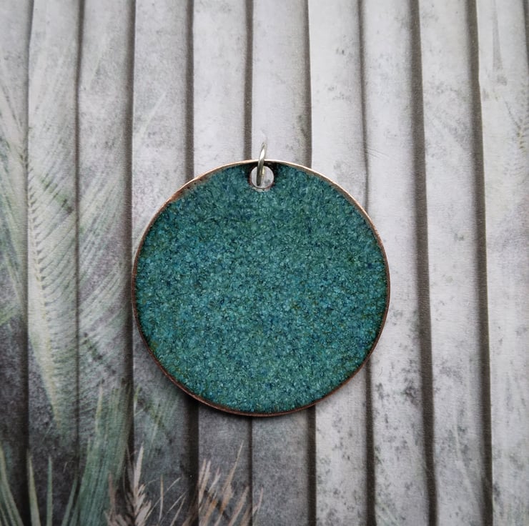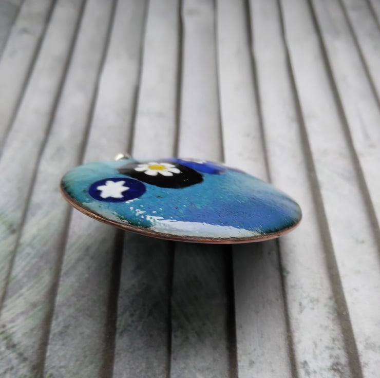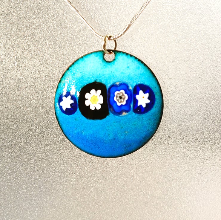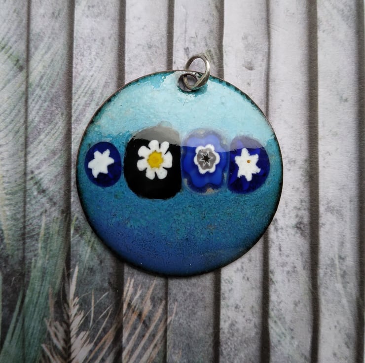 Round, domed enamelled copper pendant in shades of blue, with four millefiori inserts. The pendant has been kiln-fired and measures approximately 35mm in diameter. The back has been finished in tweedy blue enamel for comfort and aesthetics. It comes complete with a soldered sterling silver jump ring and is supplied with an 18" silver plated snake chain and a little organza pouch.