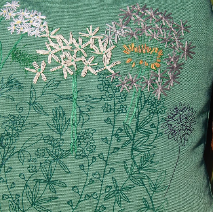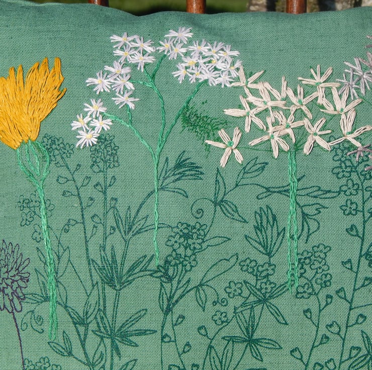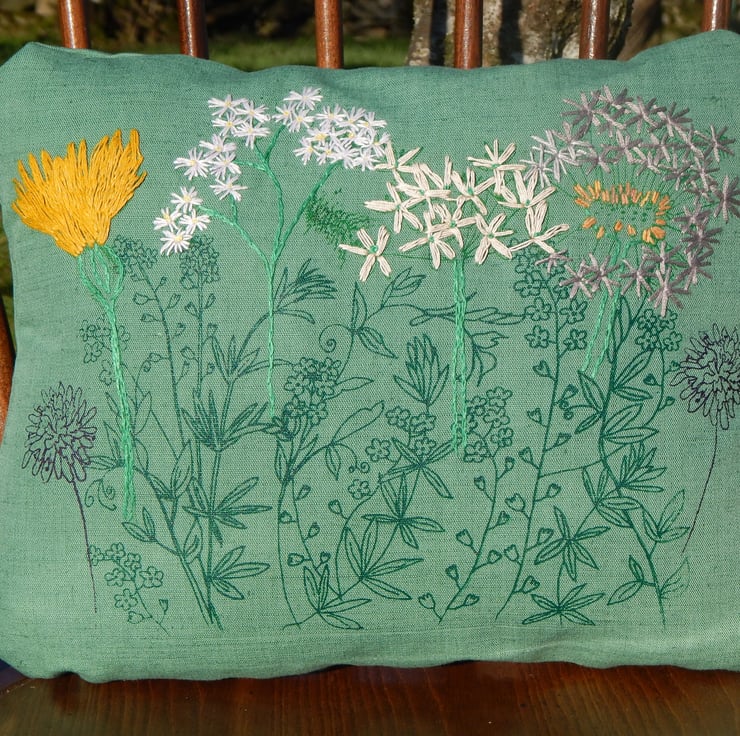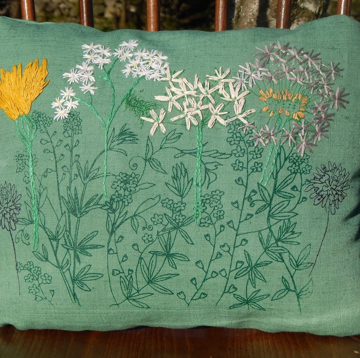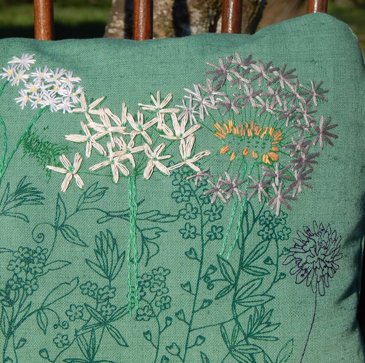 This is a green medium weight linen cushion that has been screen printed with my own designs. There is a background design of forget me nots and then various wild flowers are growing up through them. There is a dandelion clock, wild garlic, yarrow and goats beard which have all been printed individually and hand embroidered to make them pop with texture and colour.