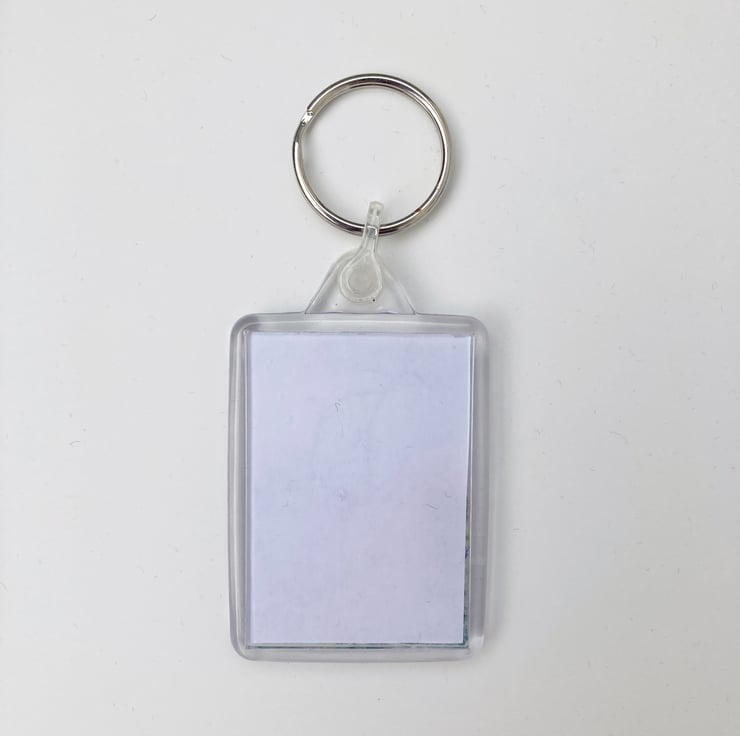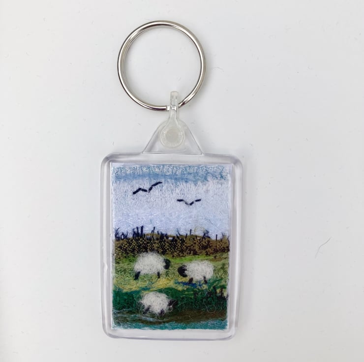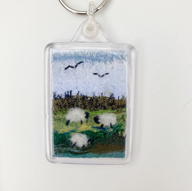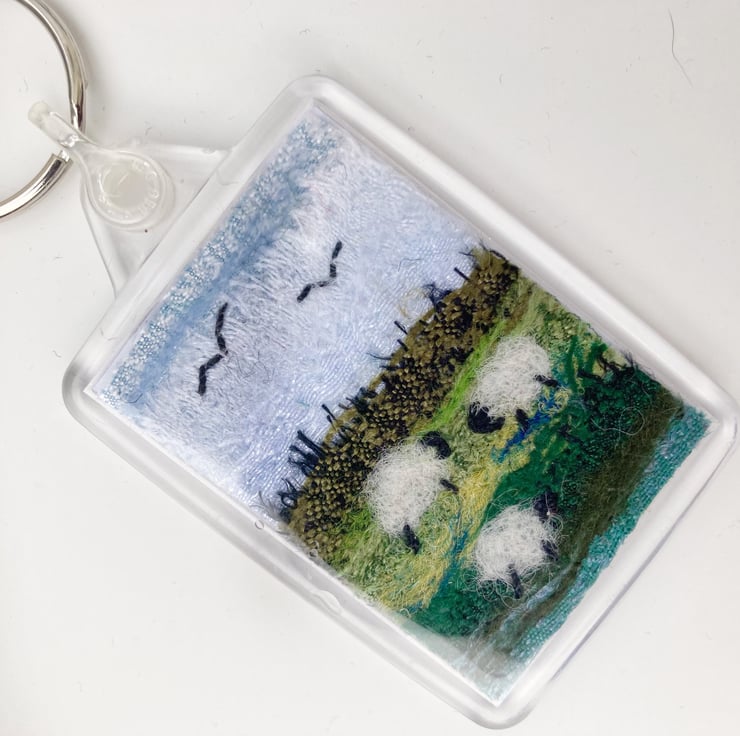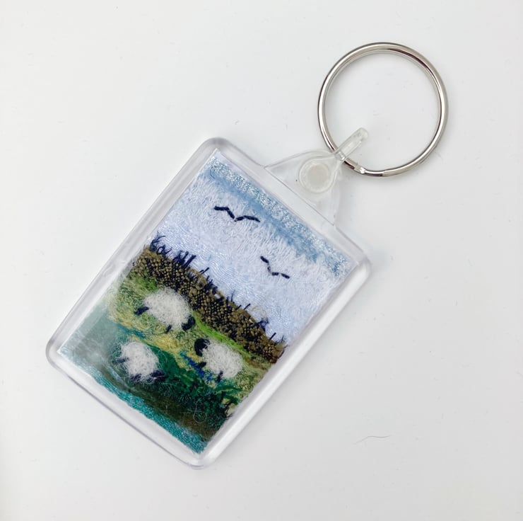 A super cute picture of some sheep grazing in a field has been used to make this The picture is a miniature piece of textile art that has been made using strips of silk fabric and woollen fibres needle felted to a felt backing sheet. The needle felting process not only binds the fabric and fibres together but also creates a lovely textured effect. The sheep have been added using woollen fibres with stitching for the head, legs and birds. The picture has been backed with a white paper sheet and enclosed in an acrylic style fob measuring approximately 5.5cm x 4cm with a split ring key ring 2.5cm in diameter attached.