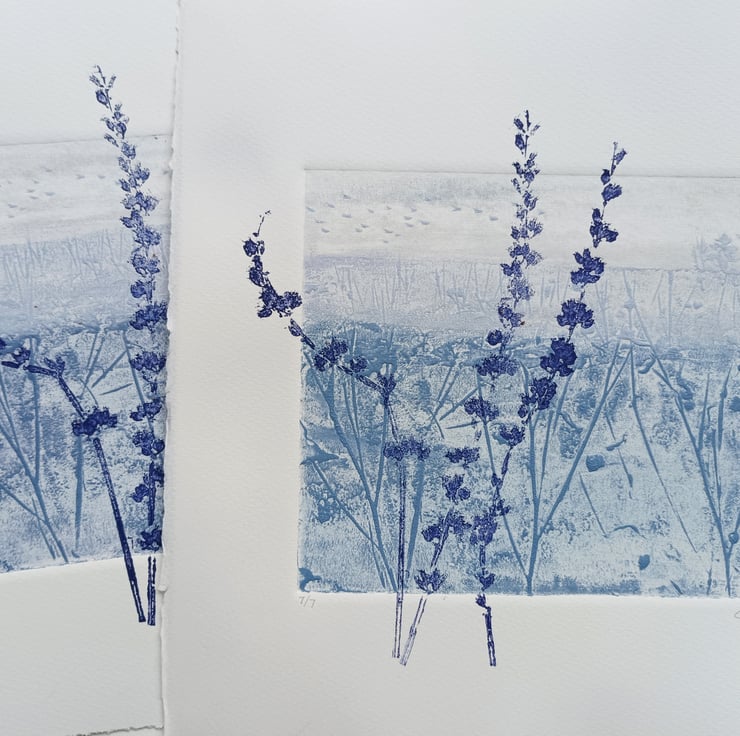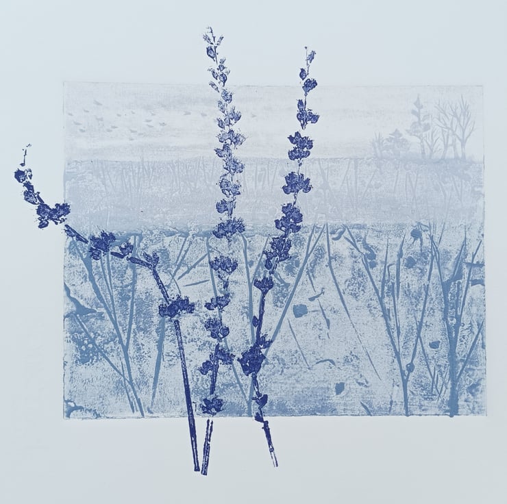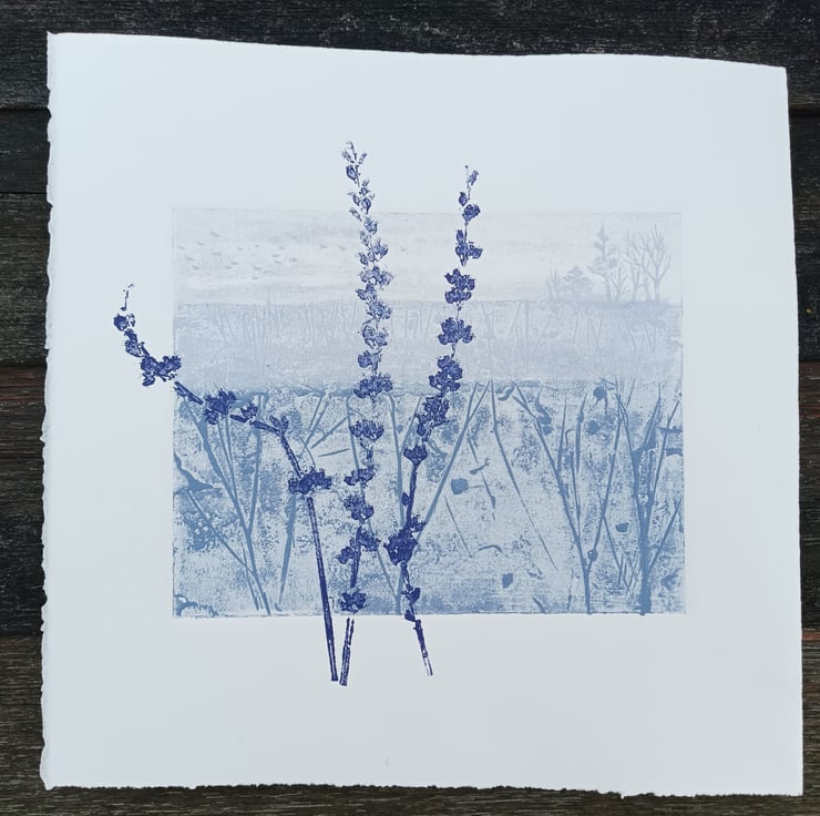 A hand printed Collagraph print with mono print. I love the hedgerow in the winter, full of frosty seed heads.