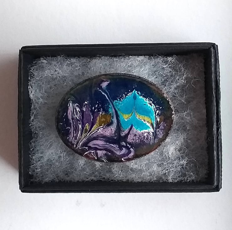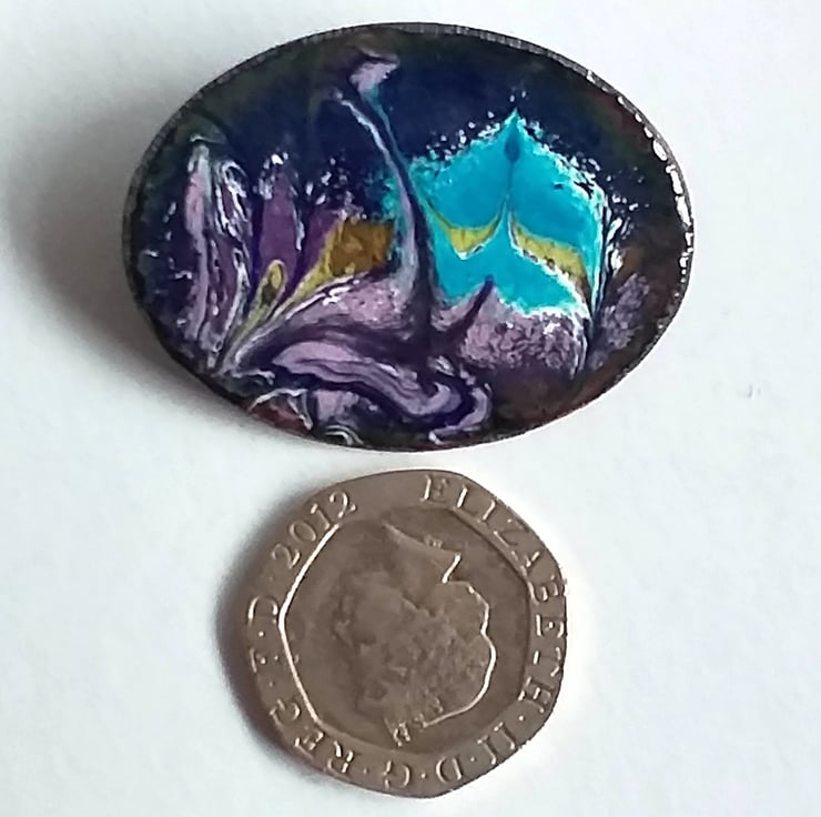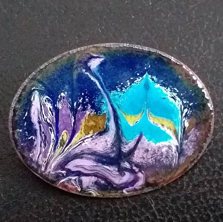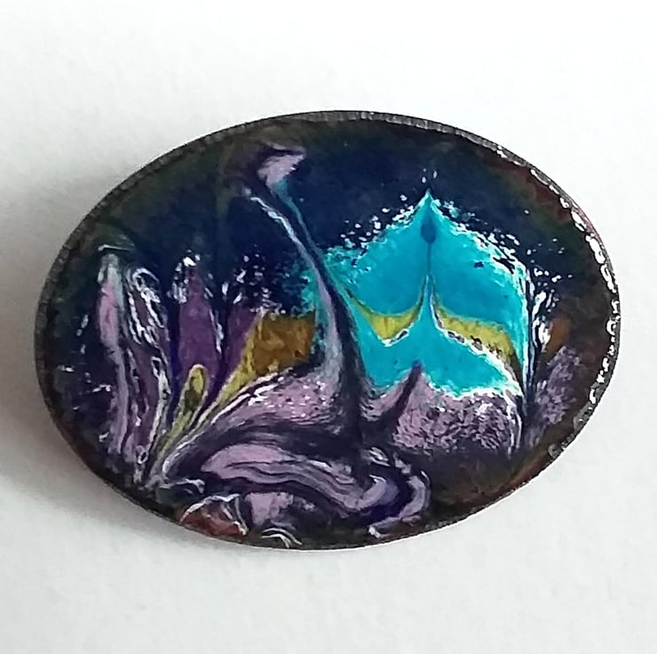 I have scattered purple and bright blue enamel on a dark blue enamel background then drawn a steel tip through the red hot enamel to make the random pattern that decorates the brooch. In some lights the copper base of the oval shows through the enamel, adding golden brown tones to the brooch.