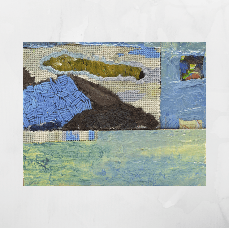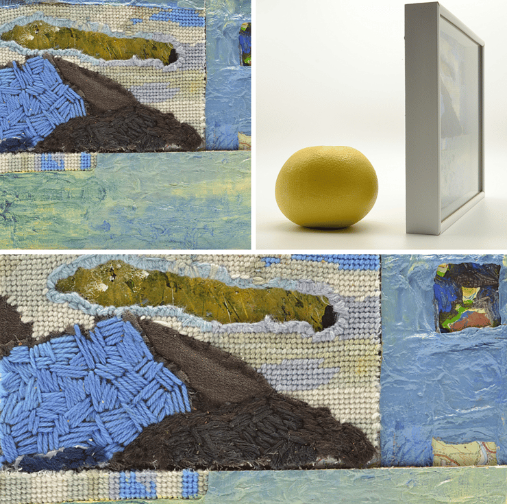 Abstract needlepoint with paint and collage. Stitched by hand using re-cycled cloth & threads. 10 x 8 inches. Framed behind glass. Signed & dated on the back. Ready to hang with felt stickers to avoid marking walls or can be freestanding.