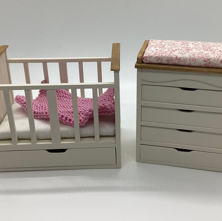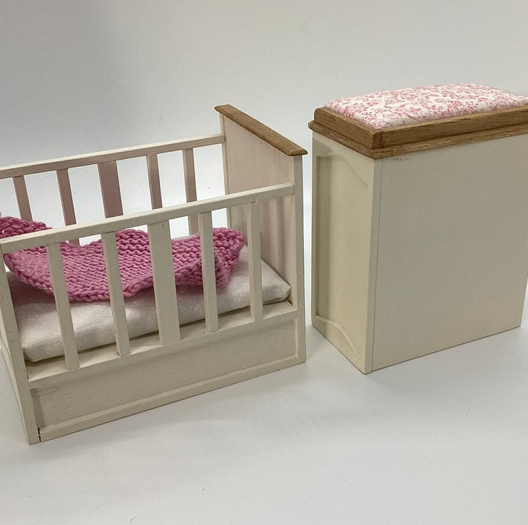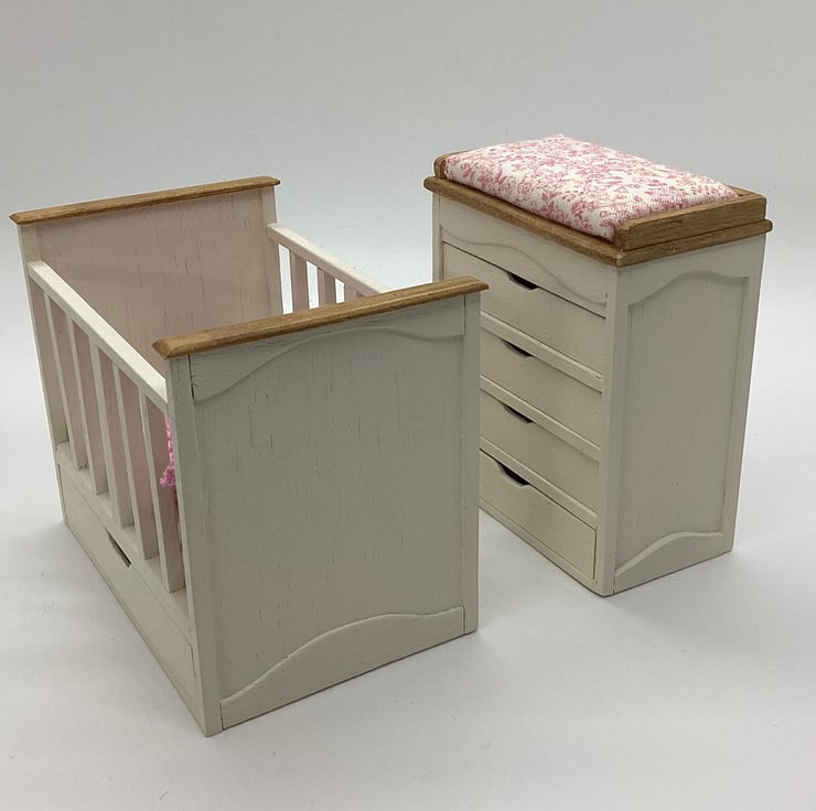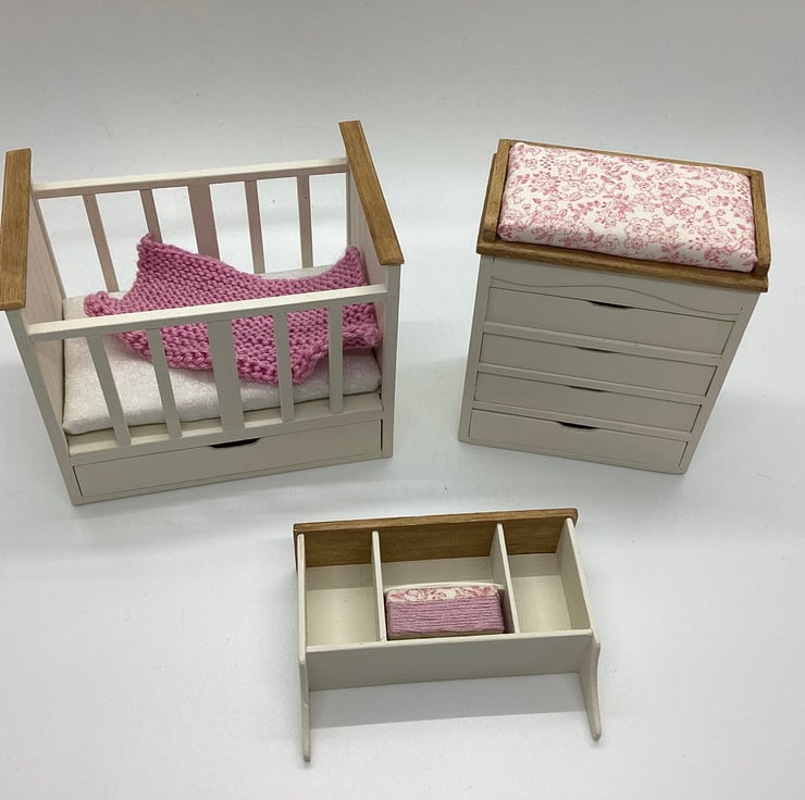 This is a sweet little nursery set, comprised of a cot, changing table and shelf. The set ties together with pretty fabrics and pink accents. All the drawers are fully functional, and the little basket is perfect for filling with miniature accessories.