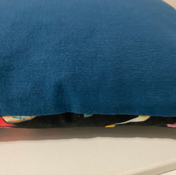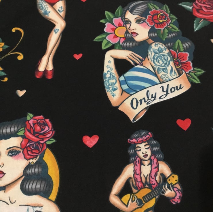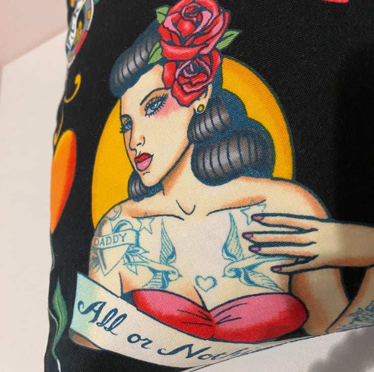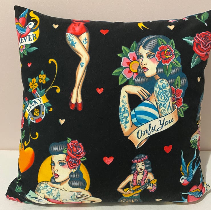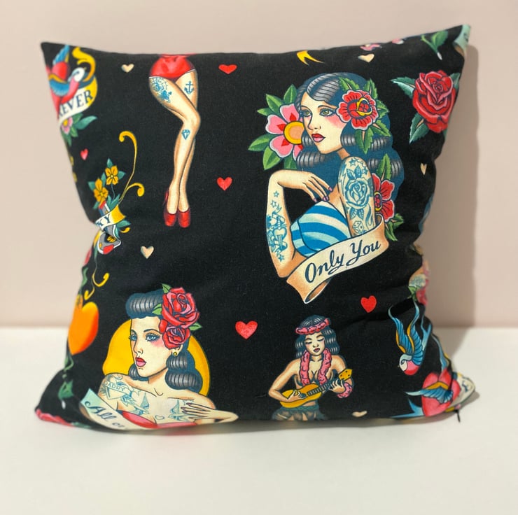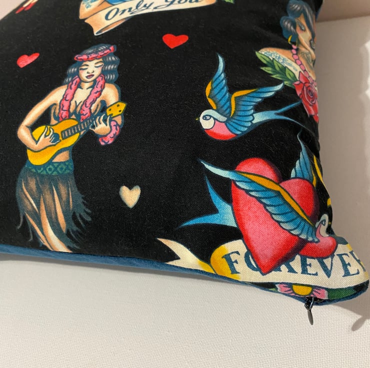 Cushion cover featuring old school tattoos on a cotton fabric from Alexander Henry, the reverse is a co ordinating petrol blue linen fabric. The cover has a concealed zip closure along the bottom, the seams have been overlocked for strength and to prevent fraying. The cushion cover is photographed with a feather cushion pad inside measuring 17”x17” this gives the cushion a full look.