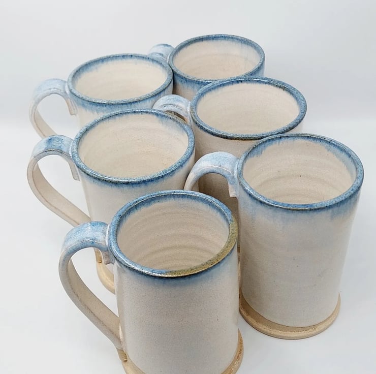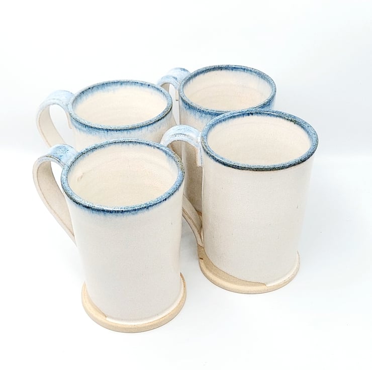 Handmade ceramic mugs with a straight wall design thrown on the potters wheel. Glazed with in white with a blue rim.