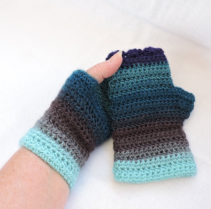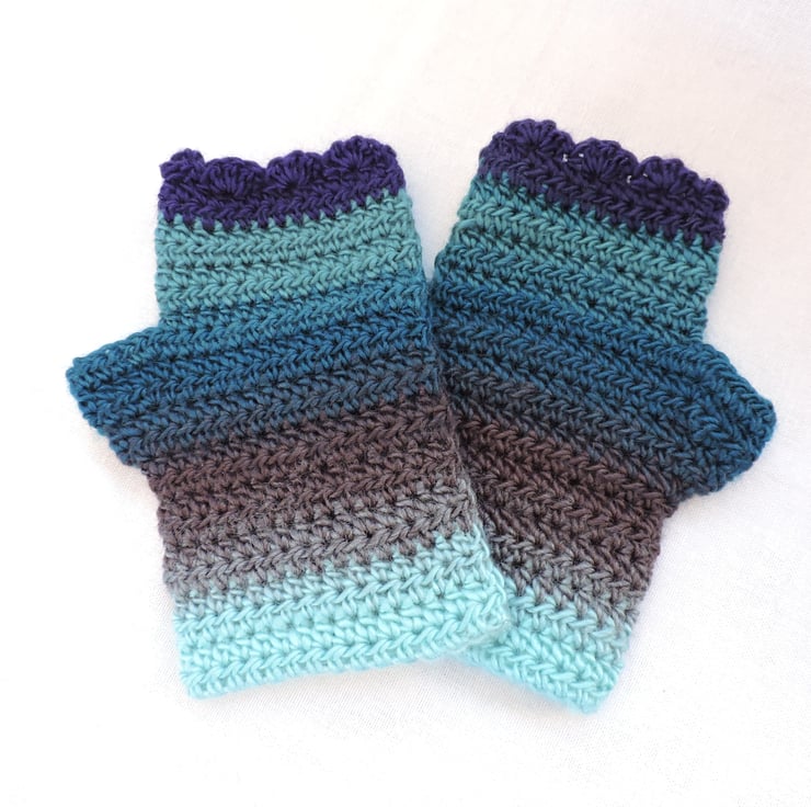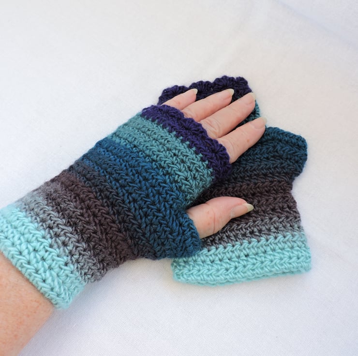 Seconds Sunday end of line clearance. These adults fingerless mitts have been crocheted using a double knit self striping acrylic yarn. Graduated colours of aqua, dark teal, light teal, charcoal grey and navy blue. They have a plain body and are finished with a wavy edge top. A soft and cosy winter warmer, ideal for dog walkers and those who need to have their fingers free.