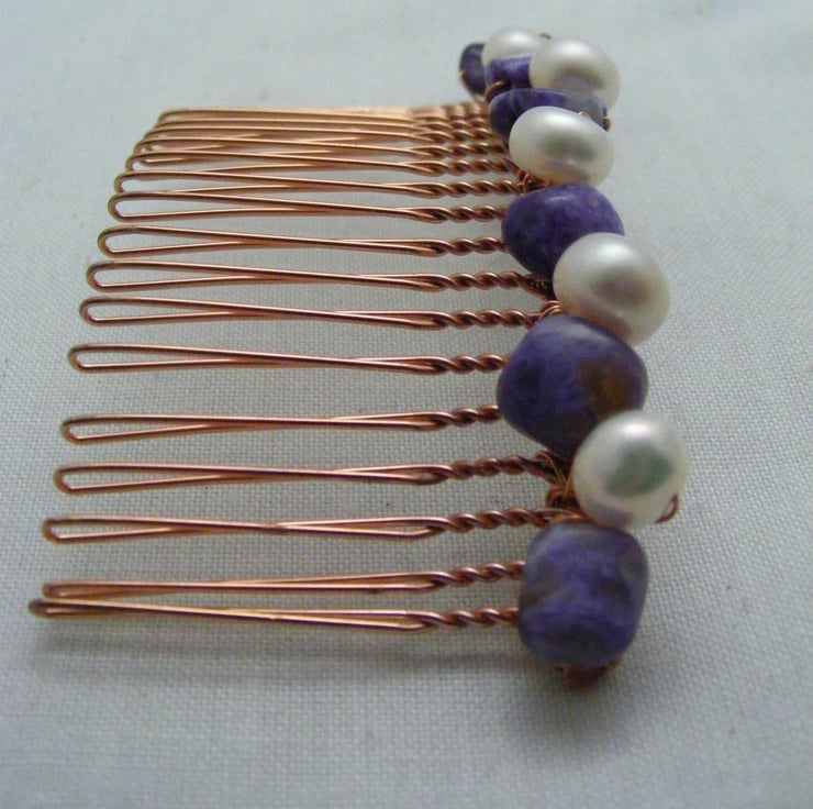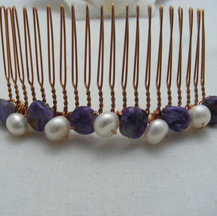 10mm irregular purple charoite gemstones, rose gold plated wire and a rose gold plated hair comb.
