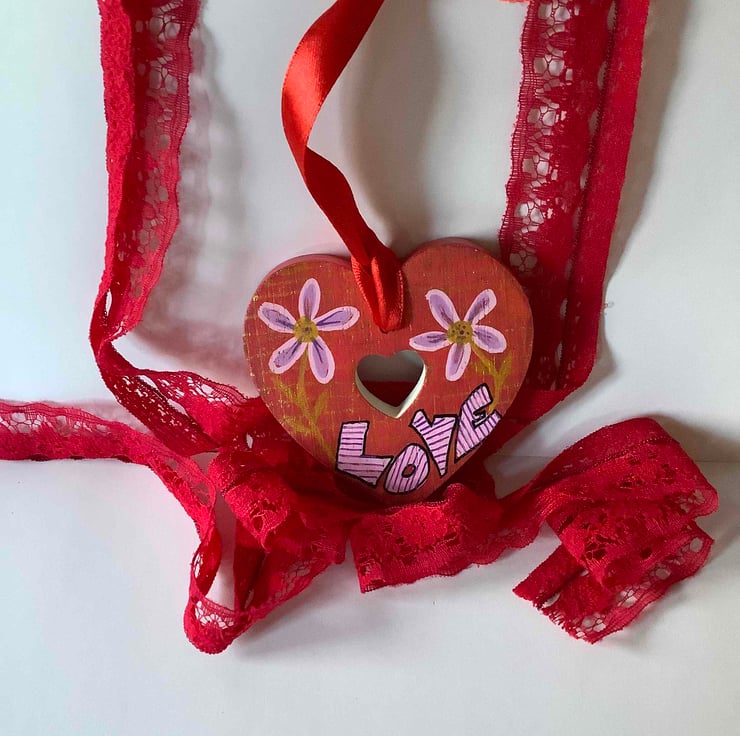 Both sides of this wooden heart have been painted red with a cross line pattern of gold.