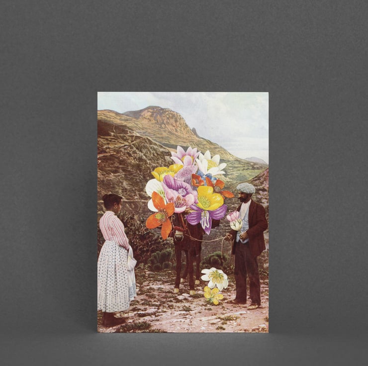 A traditional romantic floral card with a surreal edge. Donkeys are not particularly sexy but there is something about someone making an effort to carry as many flowers as they can find, just to say I LOVE YOU. Perfect for Valentine's Day or a special anniversary.