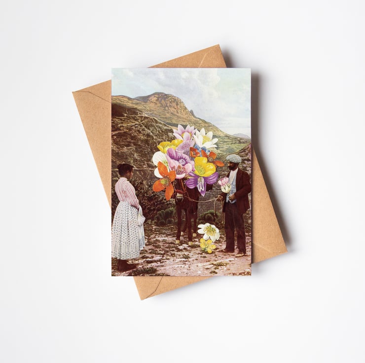 A traditional romantic floral card with a surreal edge. Donkeys are not particularly sexy but there is something about someone making an effort to carry as many flowers as they can find, just to say I LOVE YOU. Perfect for Valentine's Day or a special anniversary.