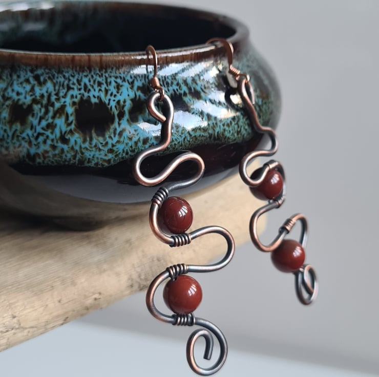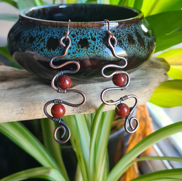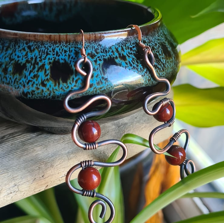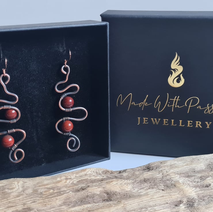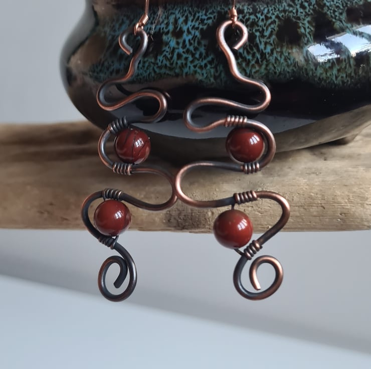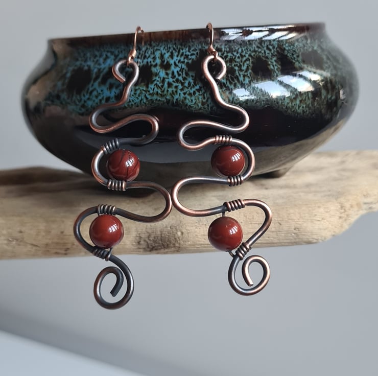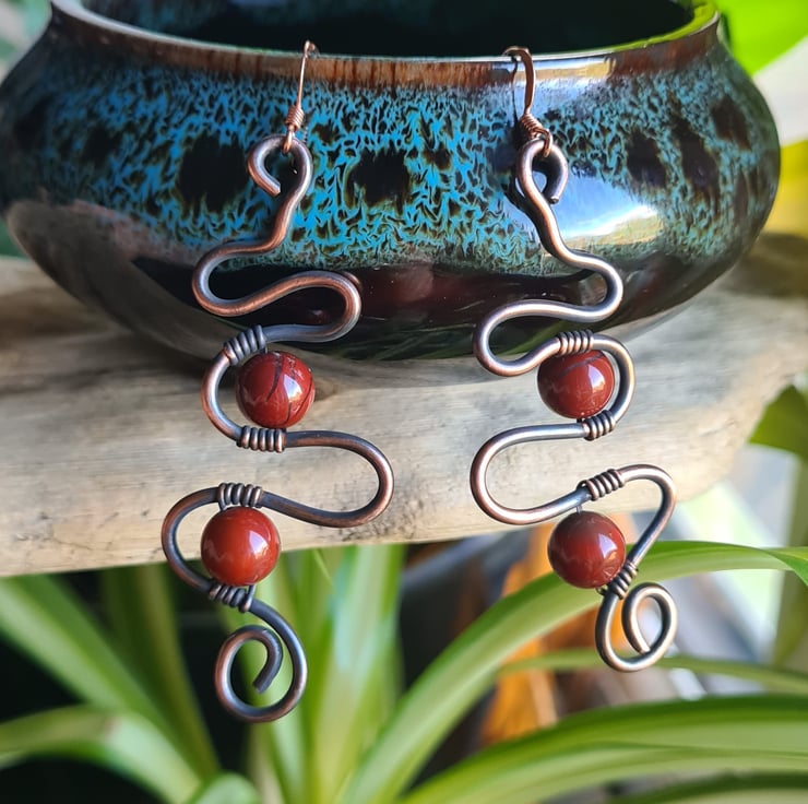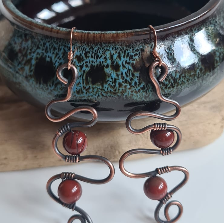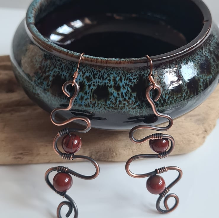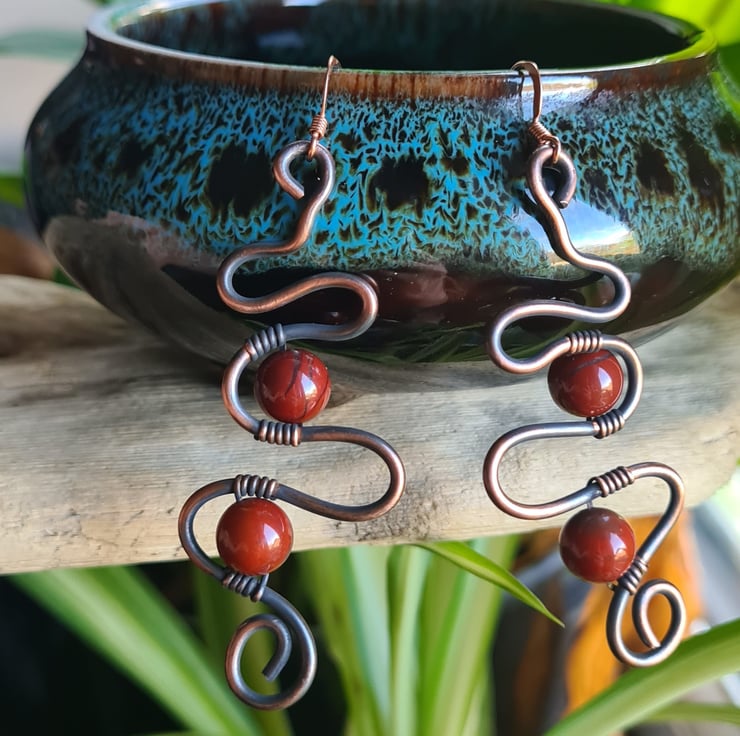 A lovely pair of handmade earrings using raw copper which has been antiqued and polished, and Natural Snakeskin Jasper. Finally finished with pure copper ear hooks. If you would like these earrings made for you with a different precious stone, bead, or metal, then please get in touch.