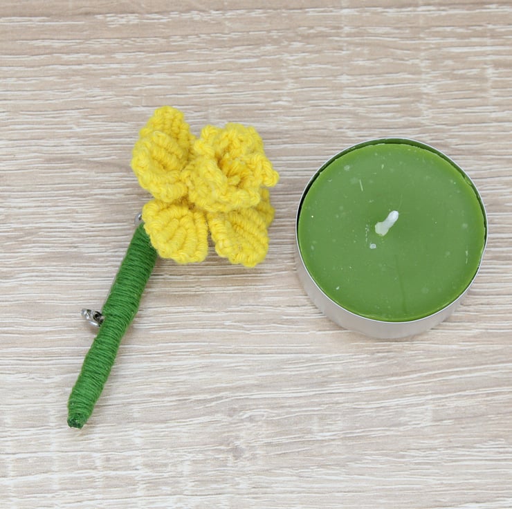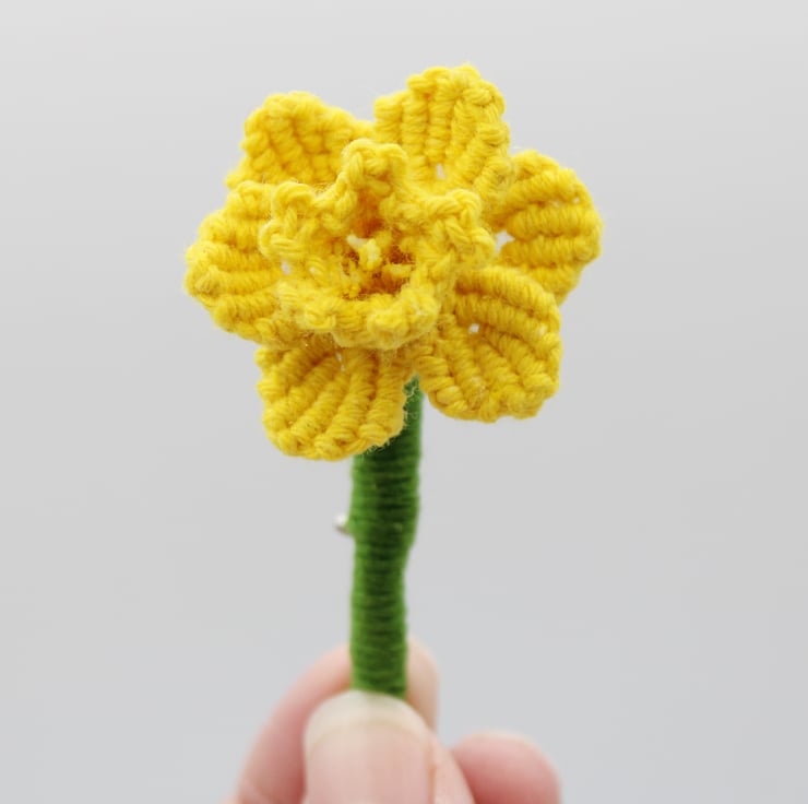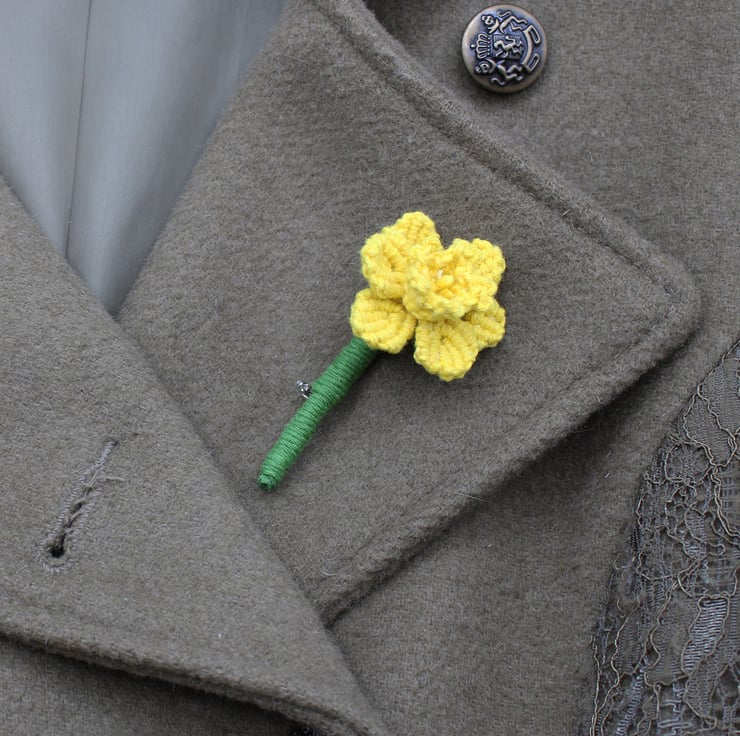 A handmade macrame daffodil brooch that is a perfect accessory to wear on St. David's Day.