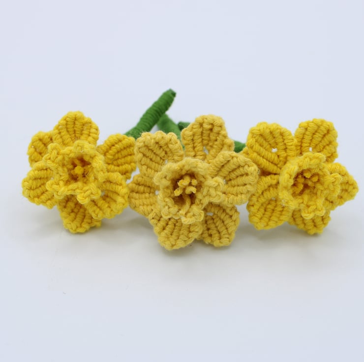 Each part of the flower has been hand knotted individually before tying together to form a traditional Spring daffodil.
