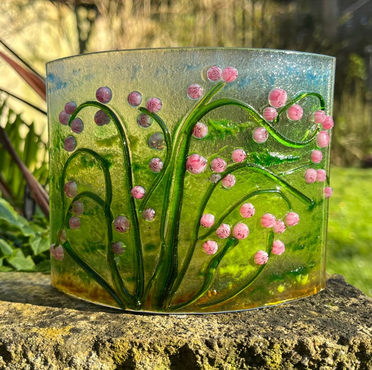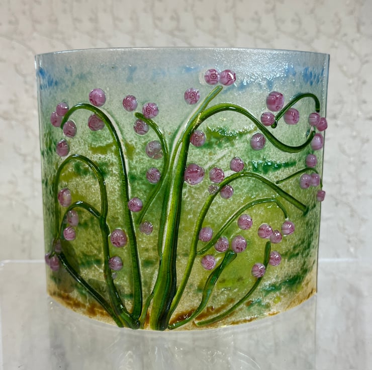 A curved glass that has been made in a rose design. Using Bullseye Murrini and stringers on a clear base with powder added. Measures H100mm x W 125mm. Can be displayed in a window or with a candle behind in the evening.