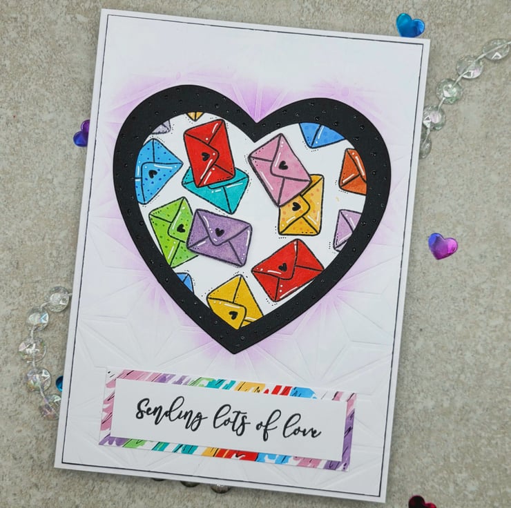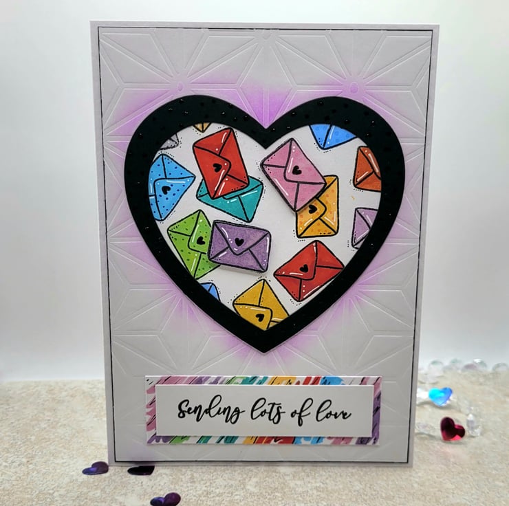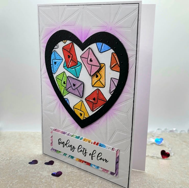 The white background has an embossed pattern, on top is a heart with ink blended under the heart in a purple violet shade and two of the letters are popped up for a little dimension.