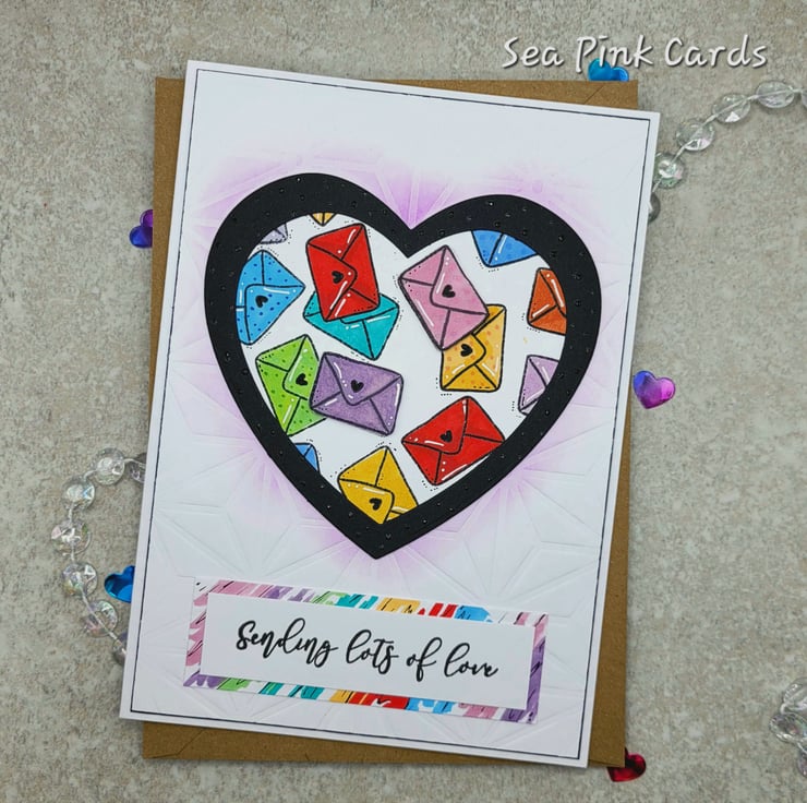 The sentiment is 'SENDING LOTS OF LOVE' and is layered onto a hand-drawn striped banner. The inside of the card is blank white for your own message.