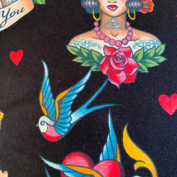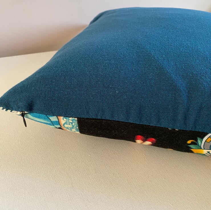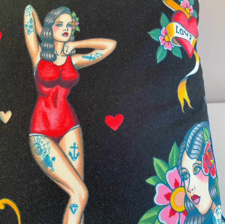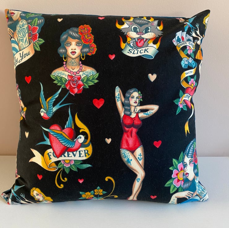Cushion cover made from a fabric from Alexander Henry featuring old school tattoos. The cover has a concealed zip closure at the bottom and a petrol blue linen back. All seams have been overlocked for strength. The photograph shows the cushion cover with a 17”x17” feather pad for a full look.