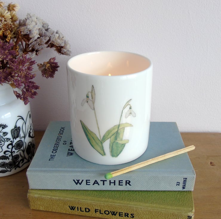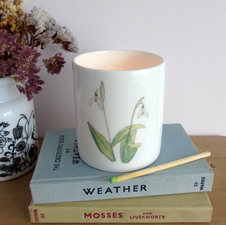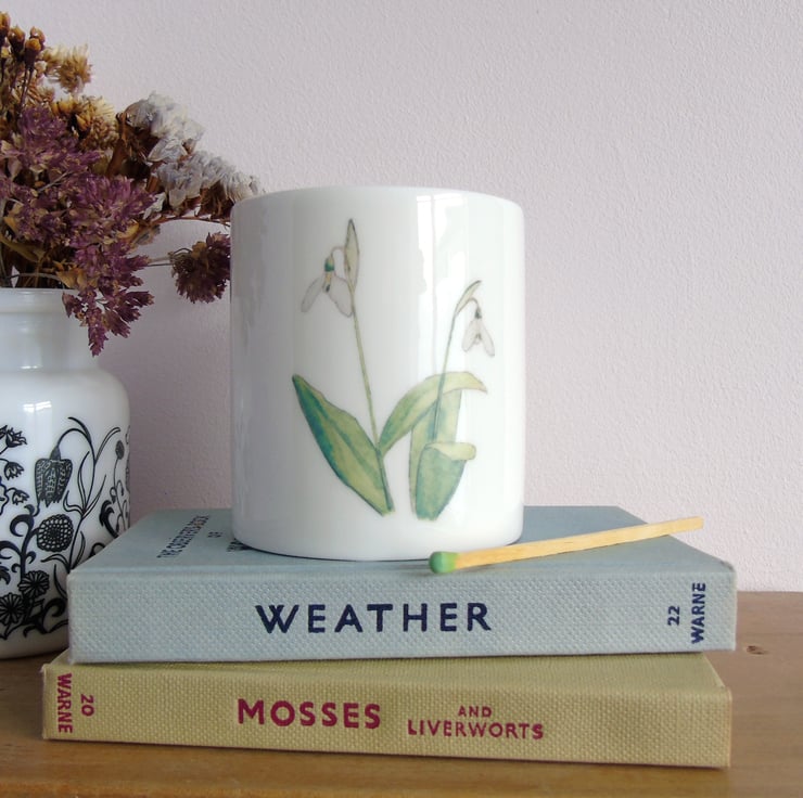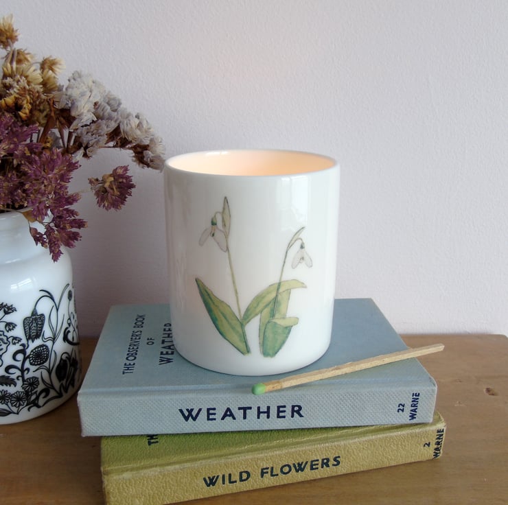 An elegant bone china, tea light holder featuring my delicate snowdrop illustration