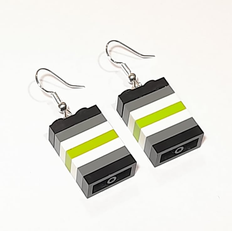 Check out these Agender pride flag earrings in the colours of black, grey, white and green, made using genuine upcycled Lego bricks. The earring hooks are silver plated, and they come gift-wrapped in pretty tissue paper.