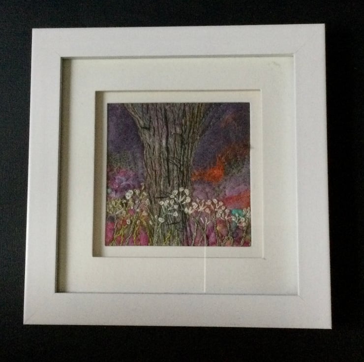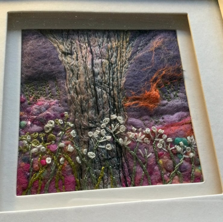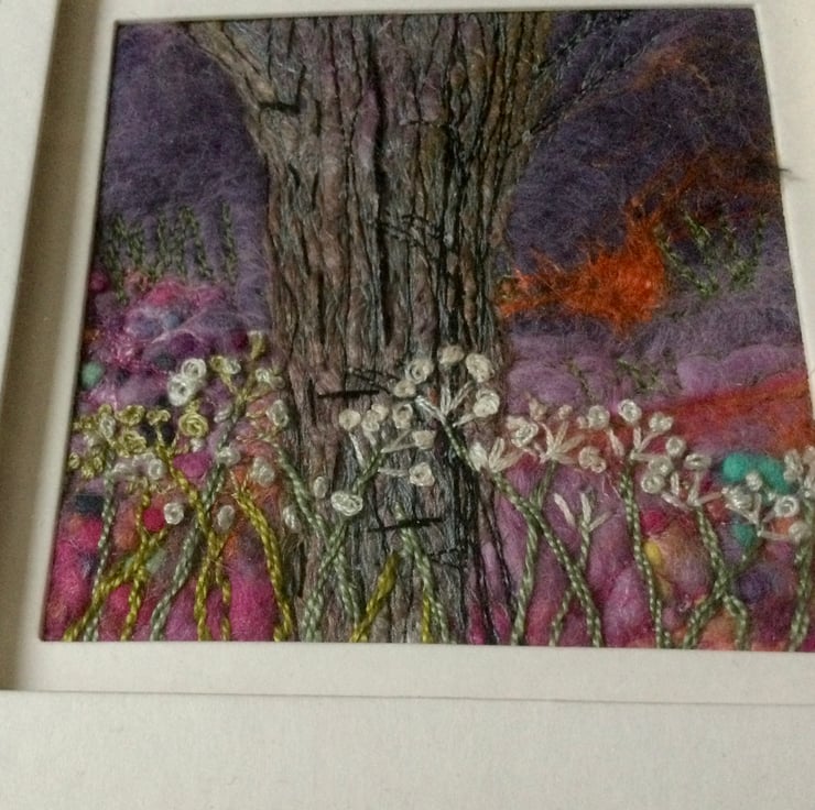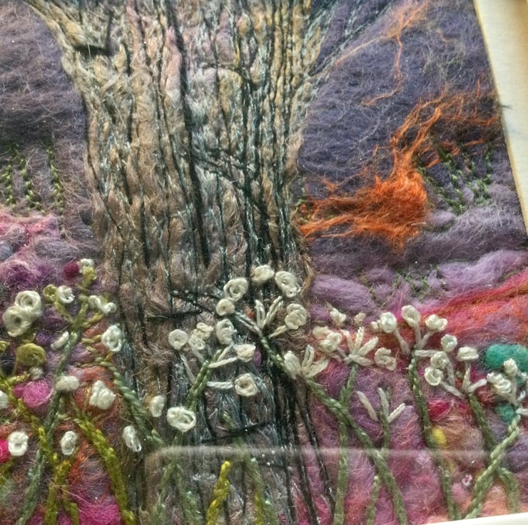 This piece is a Wet felted piece and is my interpretation of a gnarled old tree surrounded by some elder flowers, around about sunset as you can see a flash of orange in the evening purple sky. I wet felted the background with mainly Corriedale wool and used a lovely shade of purple for the evening sky and carried forward the same pinky shades into the foreground. I then used my sewing machine in free motion and created texture in the tree and finished off with some hand embroidery of the foreground Elder flowers