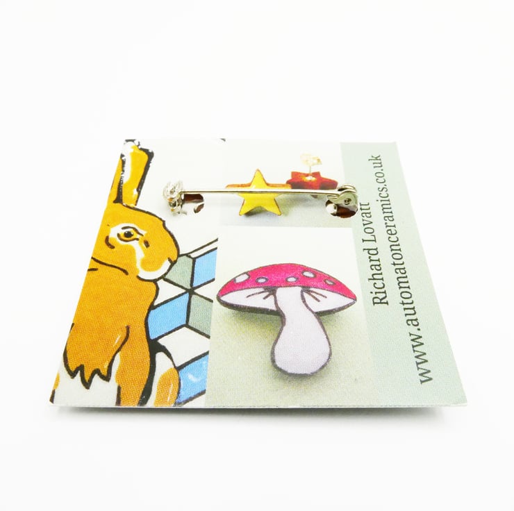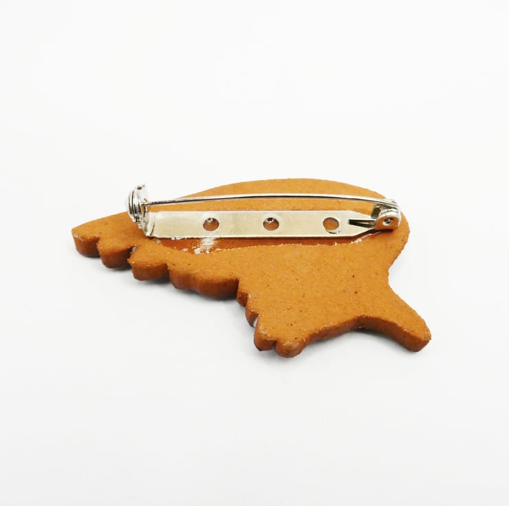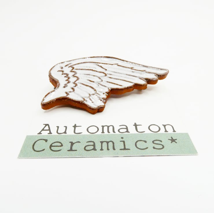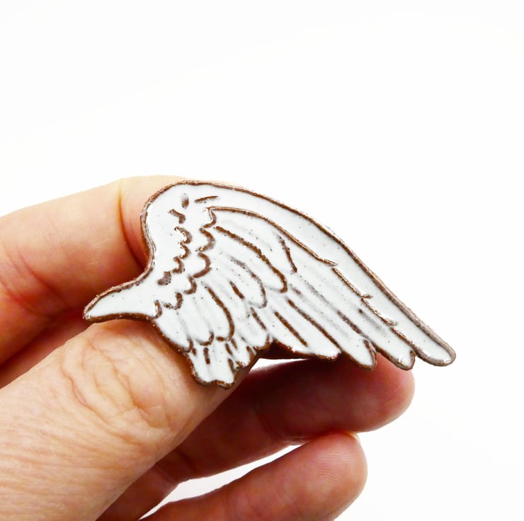 Angel wing brooch, made from an Etruscan red clat that is printed then cut out in the shape of a wing. It has a white glaze that picks out the feathers. It has a brooch fastening on the back that is glued in place.