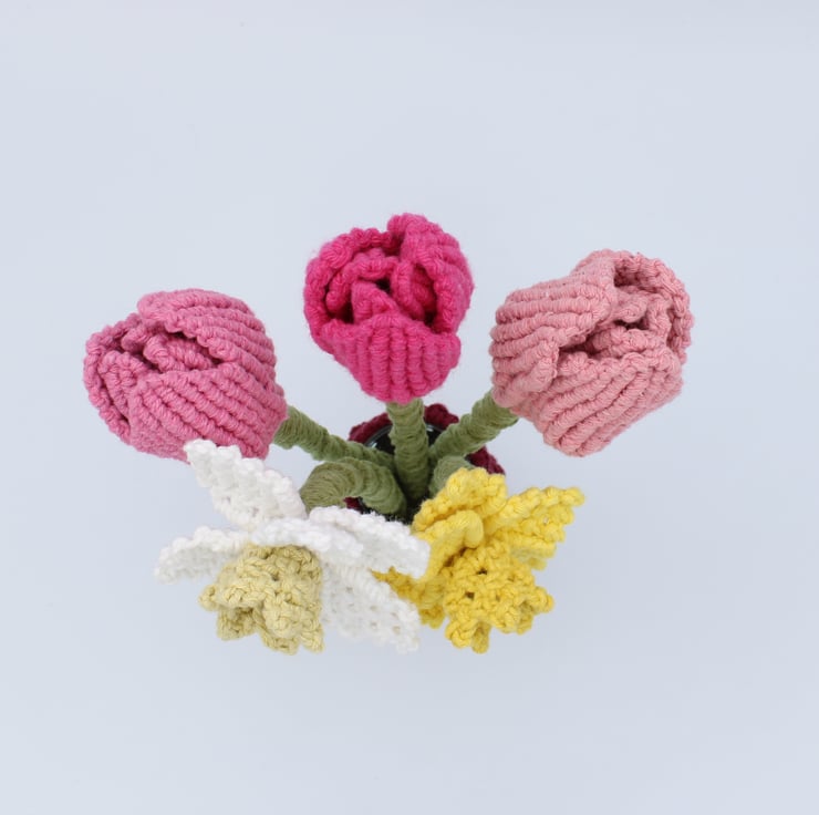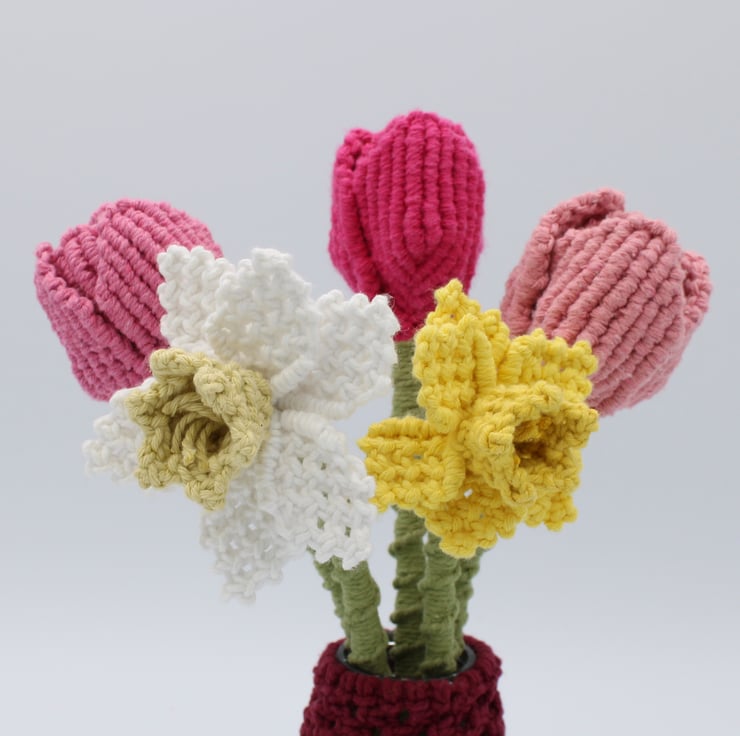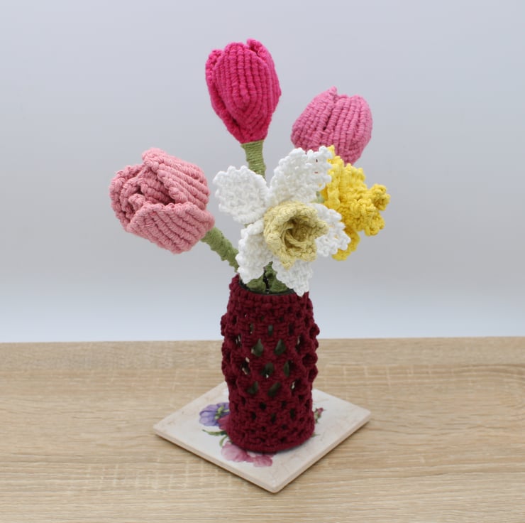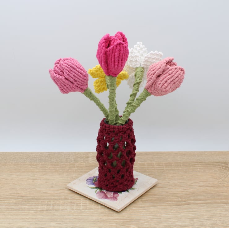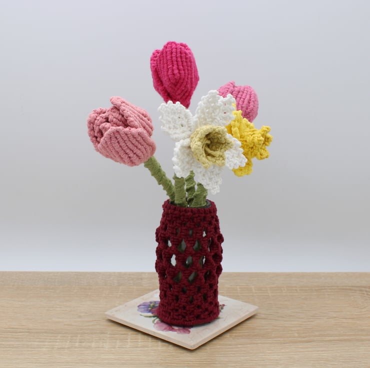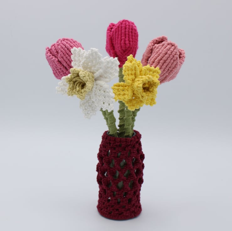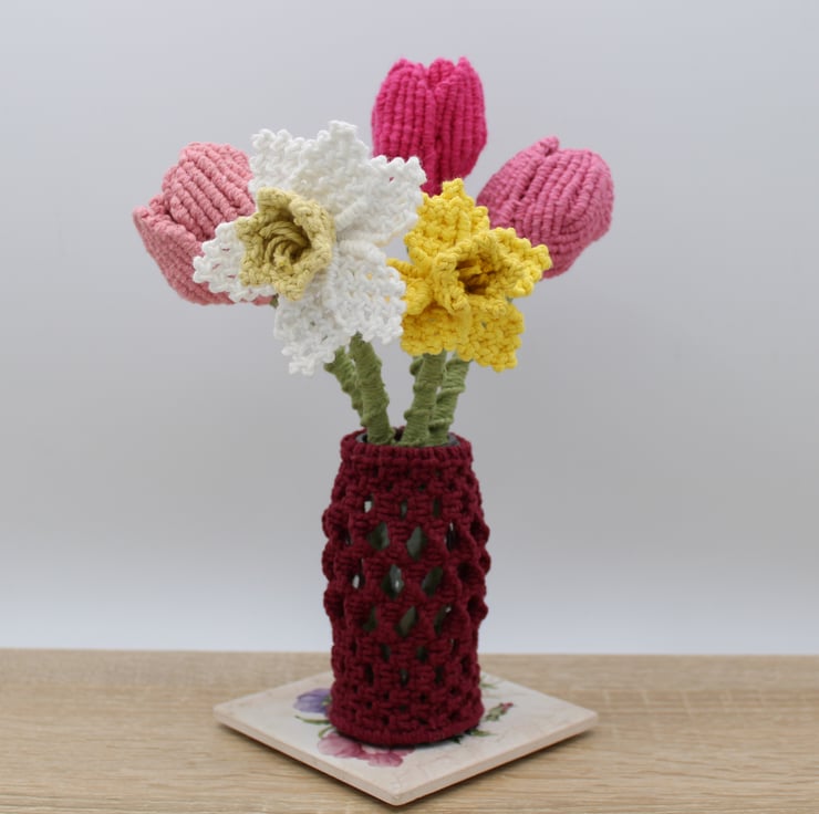 The flowers do not have any wire in them to make them poseable. The tight spiral stem knots hold the flower heads up.. The vase is a herbs and spices jar which I have upcycled with a delicate overlay of macrame in a stunning burgundy red. The deep colour of the vase works well with the colouring of the Spring flowers.