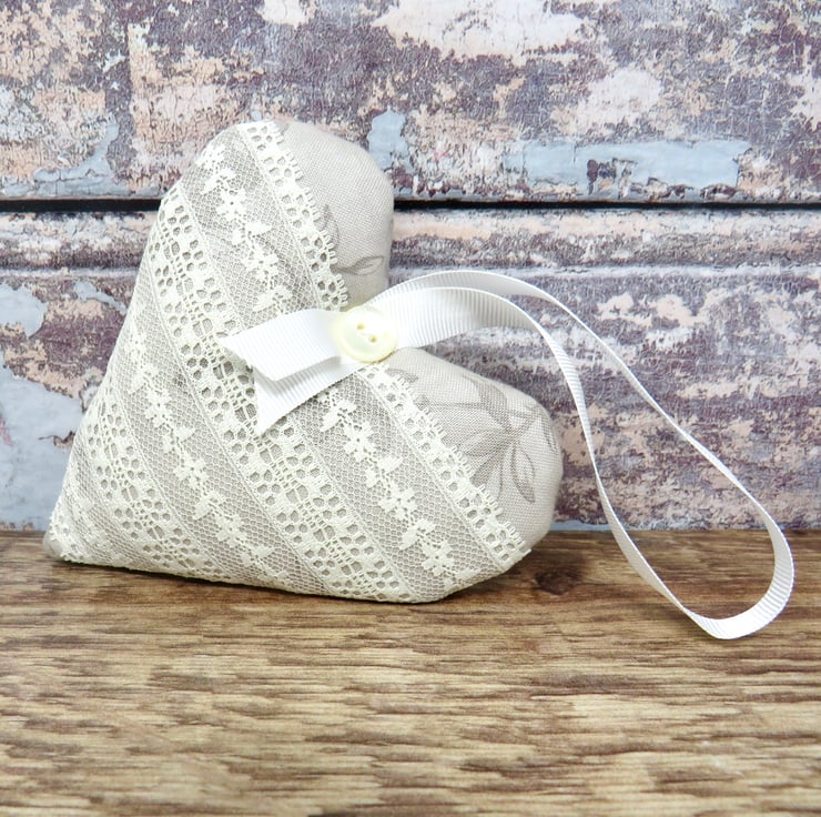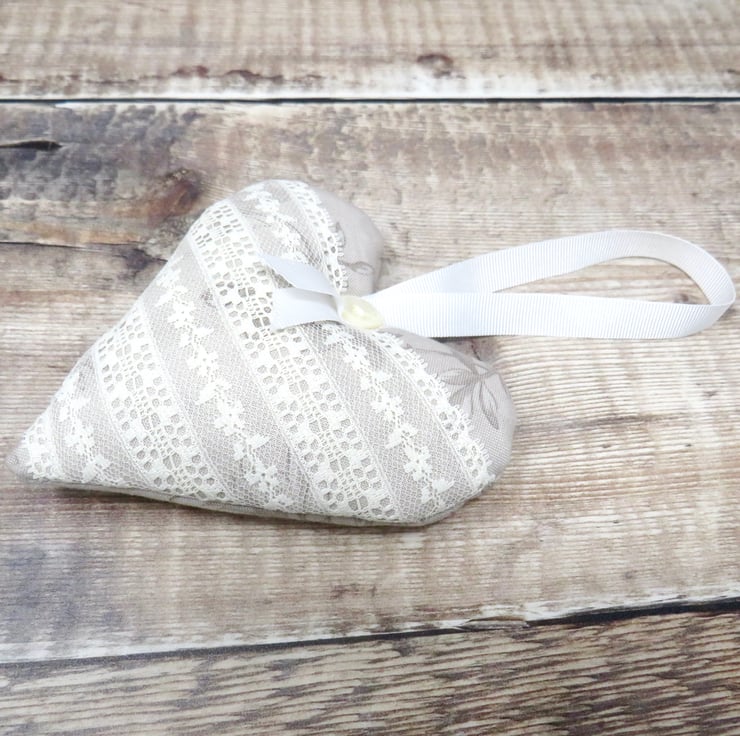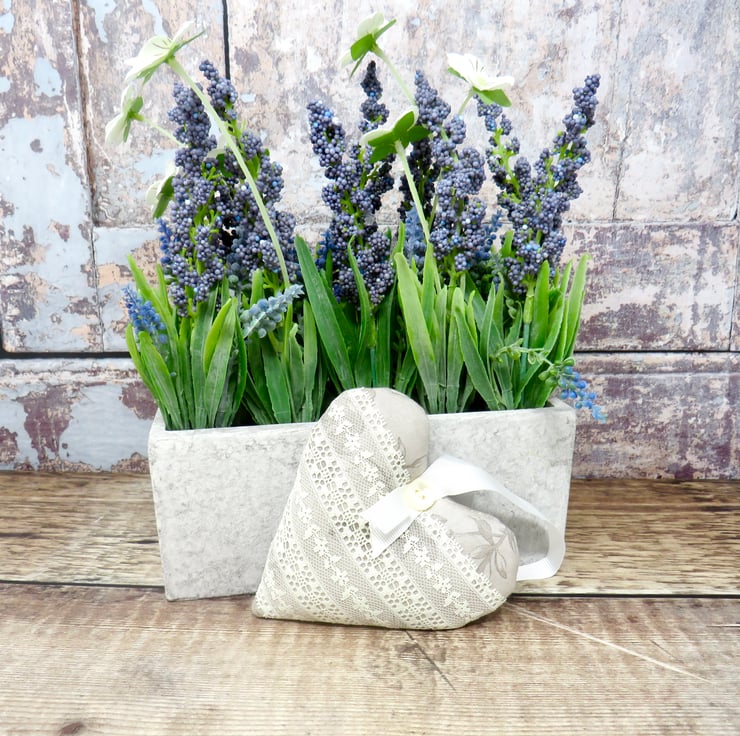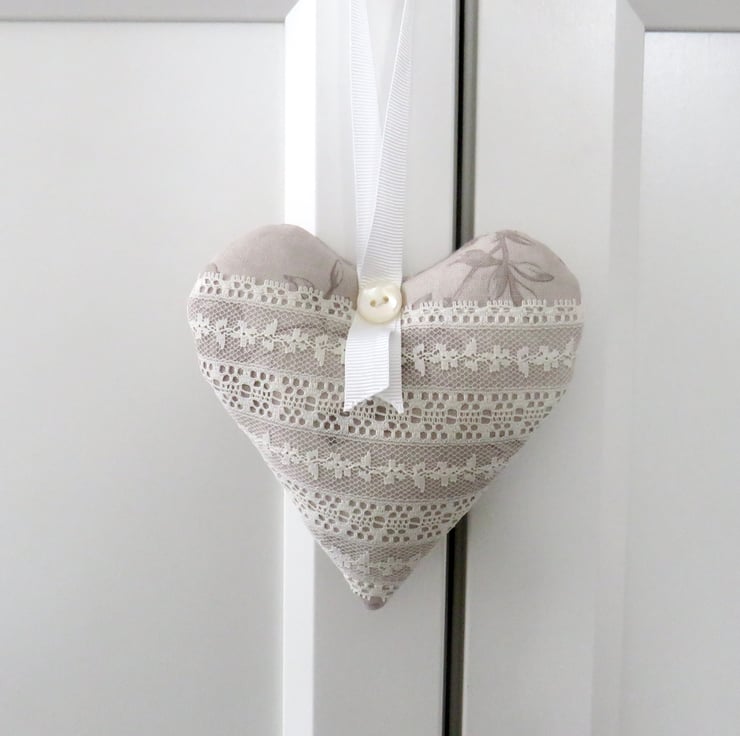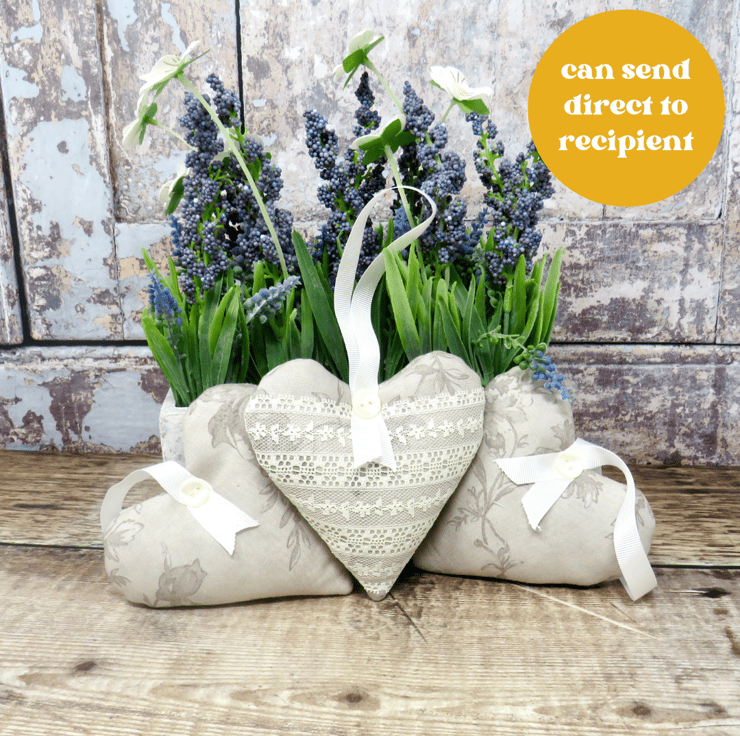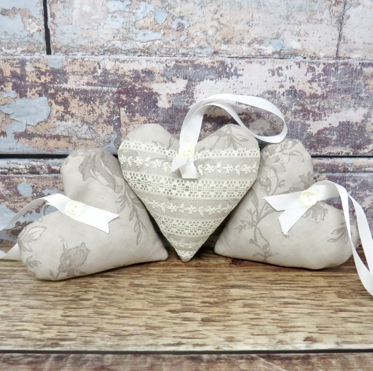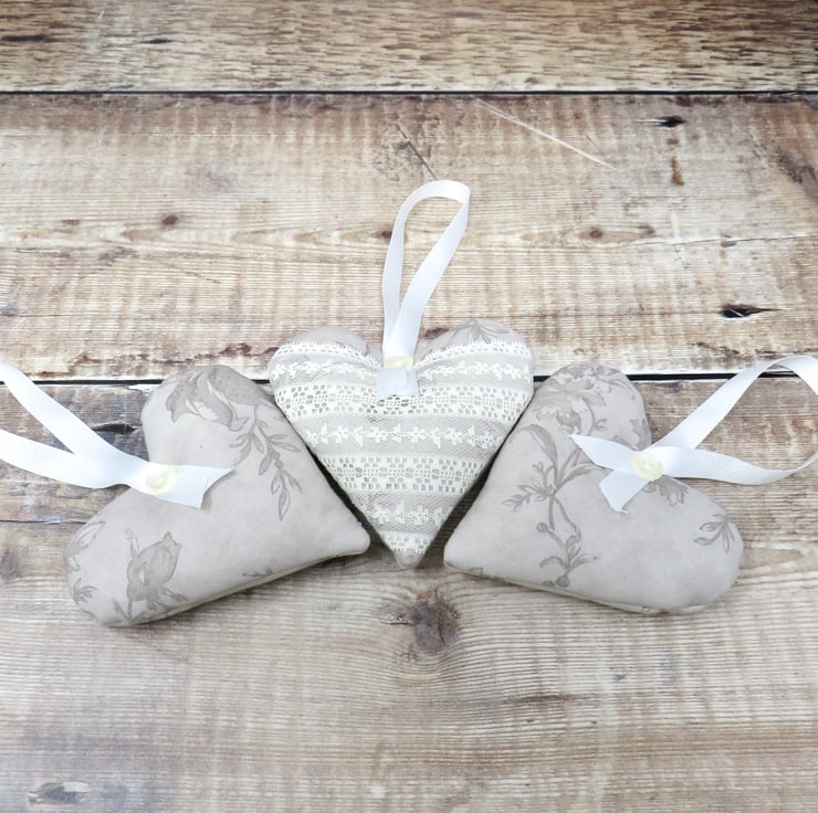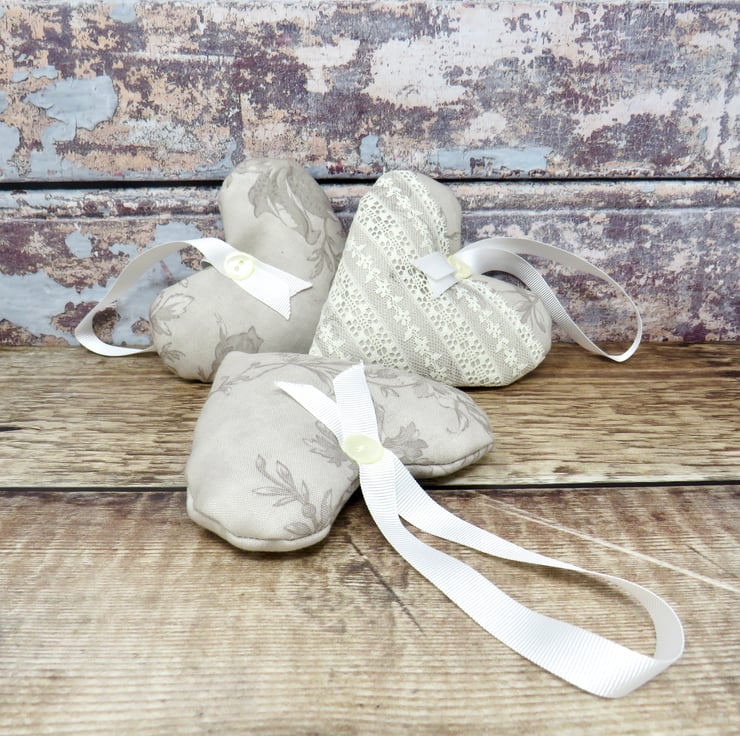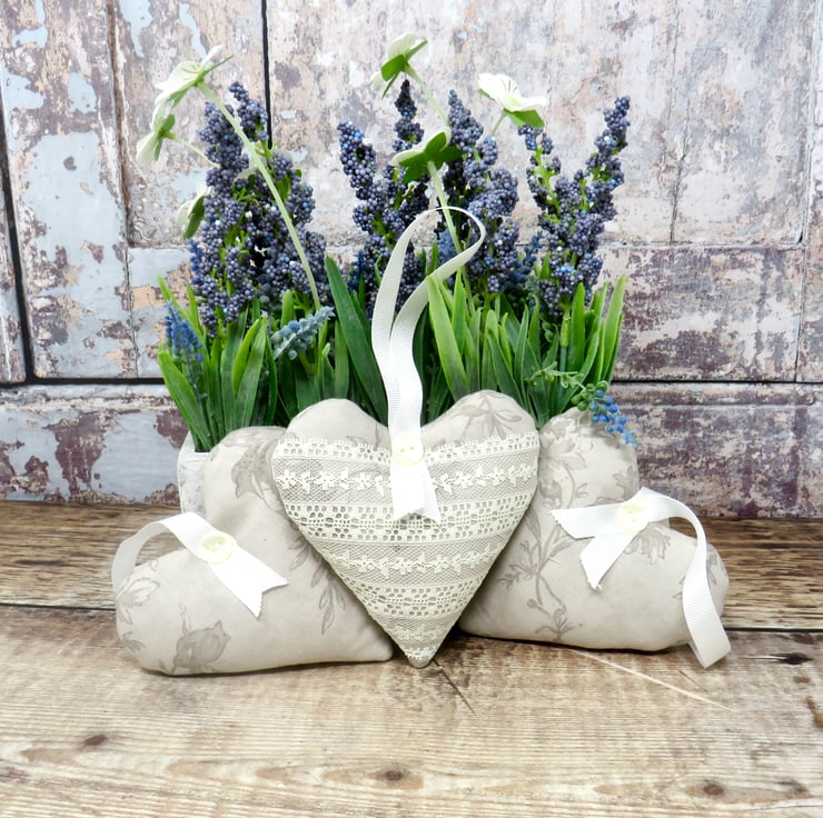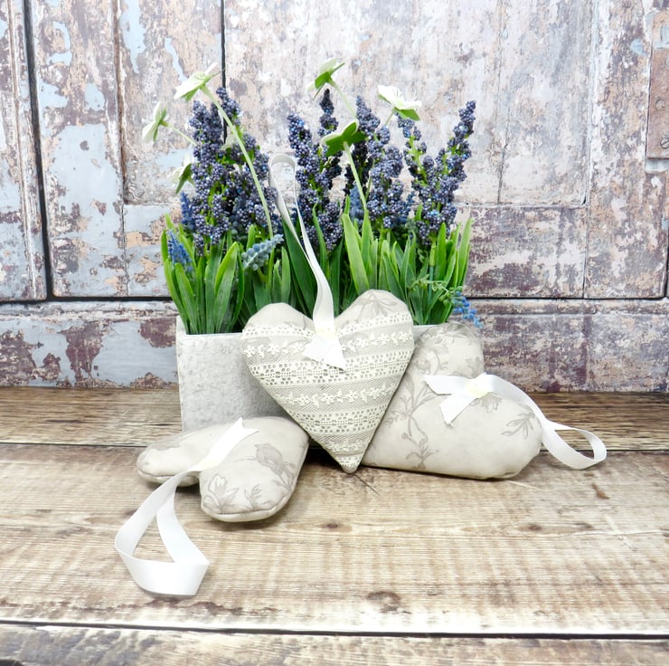 A set of three lavender scented hearts, handmade in a grey floral cotton print. One of the hearts is trimmed with white lace on the front and all have a white gross grain ribbon hanger and a pearlised button trim. Filled with wadding and a generous amount of lavender, they will scent your clothes with a wonderful natural fragrance. Each heart measures approximately 10 cm x 10 cm (4 inches). Should the fragrance start to fade a little, gently crush the heart to release more of the lavender's fragrance.