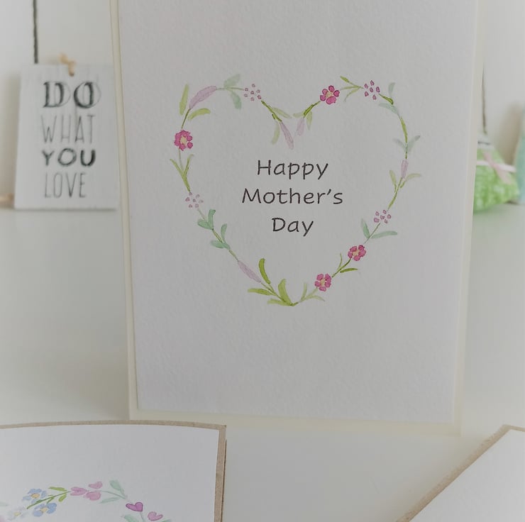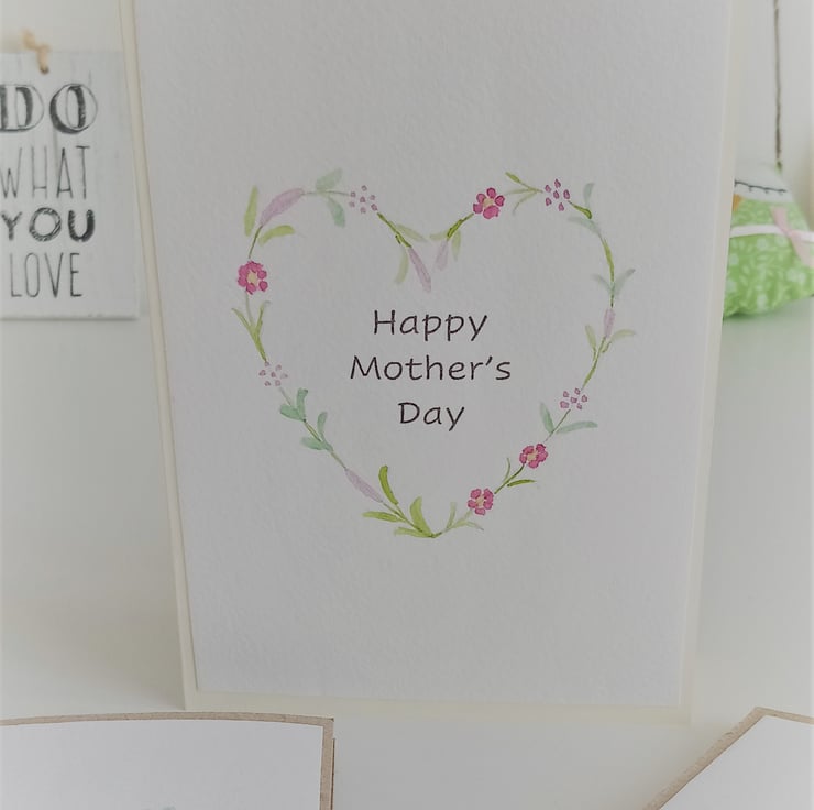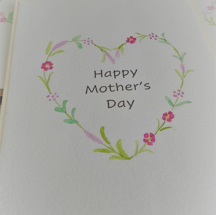 This flower wreath inspired card has been hand painted in water colours of pink, purple and green tones. The card is made from cream coloured card and comes with a matching envelope. The words Happy Mothers Day are on the front of the card.