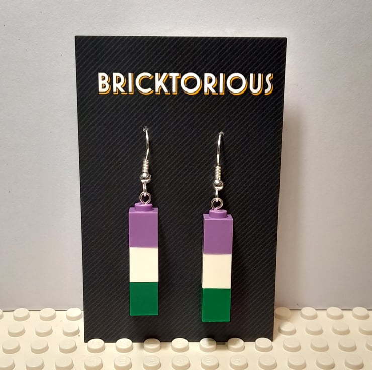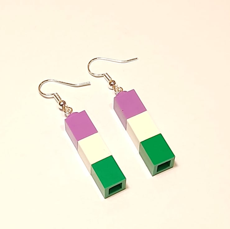 Check out these Genderqueer pride flag earrings in the colours of purple, white and green, made using genuine upcycled Lego bricks. The earring hooks are silver plated, and they come gift-wrapped in pretty tissue paper.