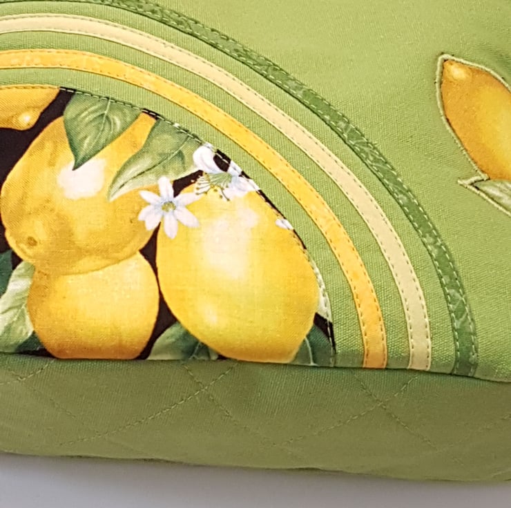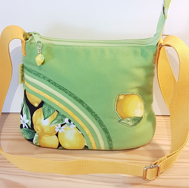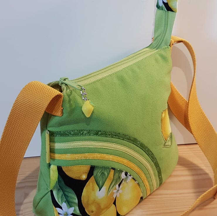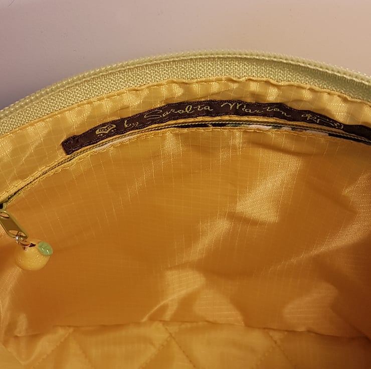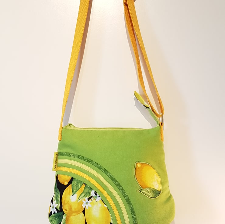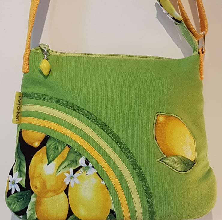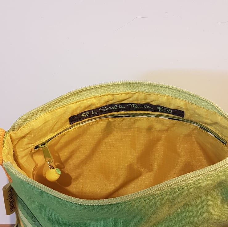 Lime green shoulder bag with lemon pattern. The canvas handbag made with patchwork and applique techniques. The bag closing with zip on the top of the bag,the shoulder strap is adjustable. The lining of the bag made from waterproof fabric. The handbag has inner pocket with zipper closure. This is a smaller bag, the dimensions are: width 25cm on the bottom of the bag, height: 20cm,depth:8cm