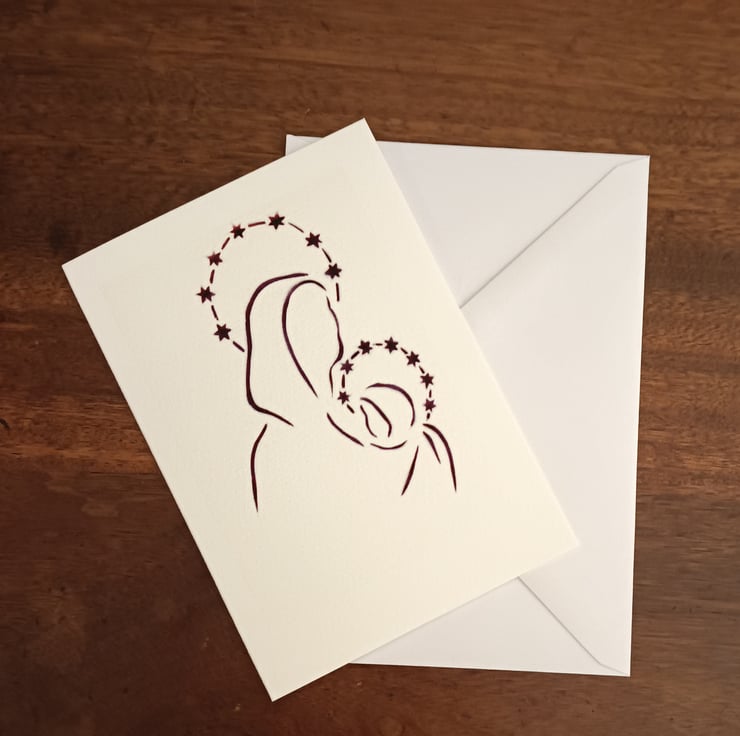 I made the original design for this Religious inspired handmade Christmas card of Mary and Jesus with halos made of stars, from hand cut stencils based on one of my original drawings and then airbrushed my design onto fine art card. The inks are no longer available so I scanned the card.