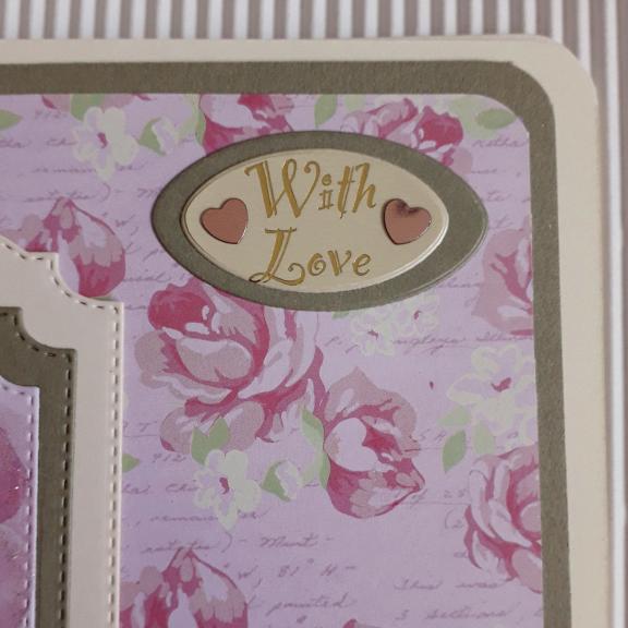There is a die cut bow at the bottom of the topper and a "With Love" sentiment on a small oval mat in the top right hand corner.