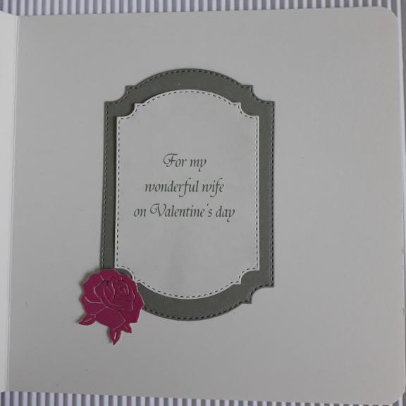 Inside the card are the words "For my wonderful wife on Valentine's day" in the same shaped frame as on the front, and a die cut pink rose to the bottom left corner.