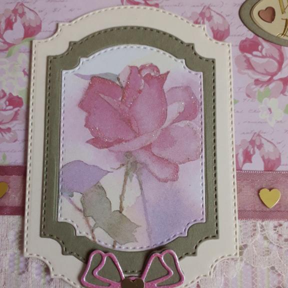 I have placed an image of a lovely pink rose in an olive green and ivory frame, then a split background of rose patterned and striped paper. there is a strip of cream lace over the striped paper with rose pink ribbon and gold heart sequins on top.