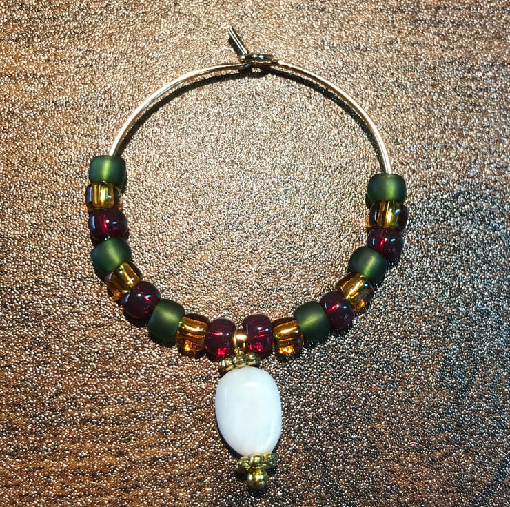 Eye catching single wine glass charm in 2023 Folksy Pantone Colours of the Year: Majestic Magenta, Yellow Ochre and Dark Moss.
